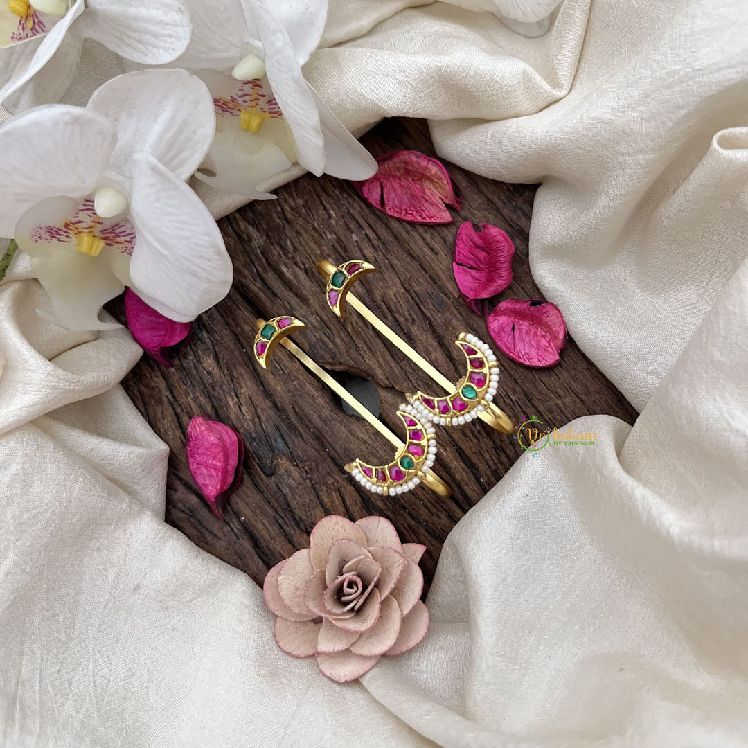 The Vriksham Elegant Half Moon Jadau Ear Cuffs with Pearls in red and green feature a graceful half-moon design enriched with delicate jadau craftsmanship and pearl accents. This sophisticated piece elegantly combines traditional artistry with vibrant hues, offering a refined accessory that enhances your festive and formal ensembles without requiring piercings.