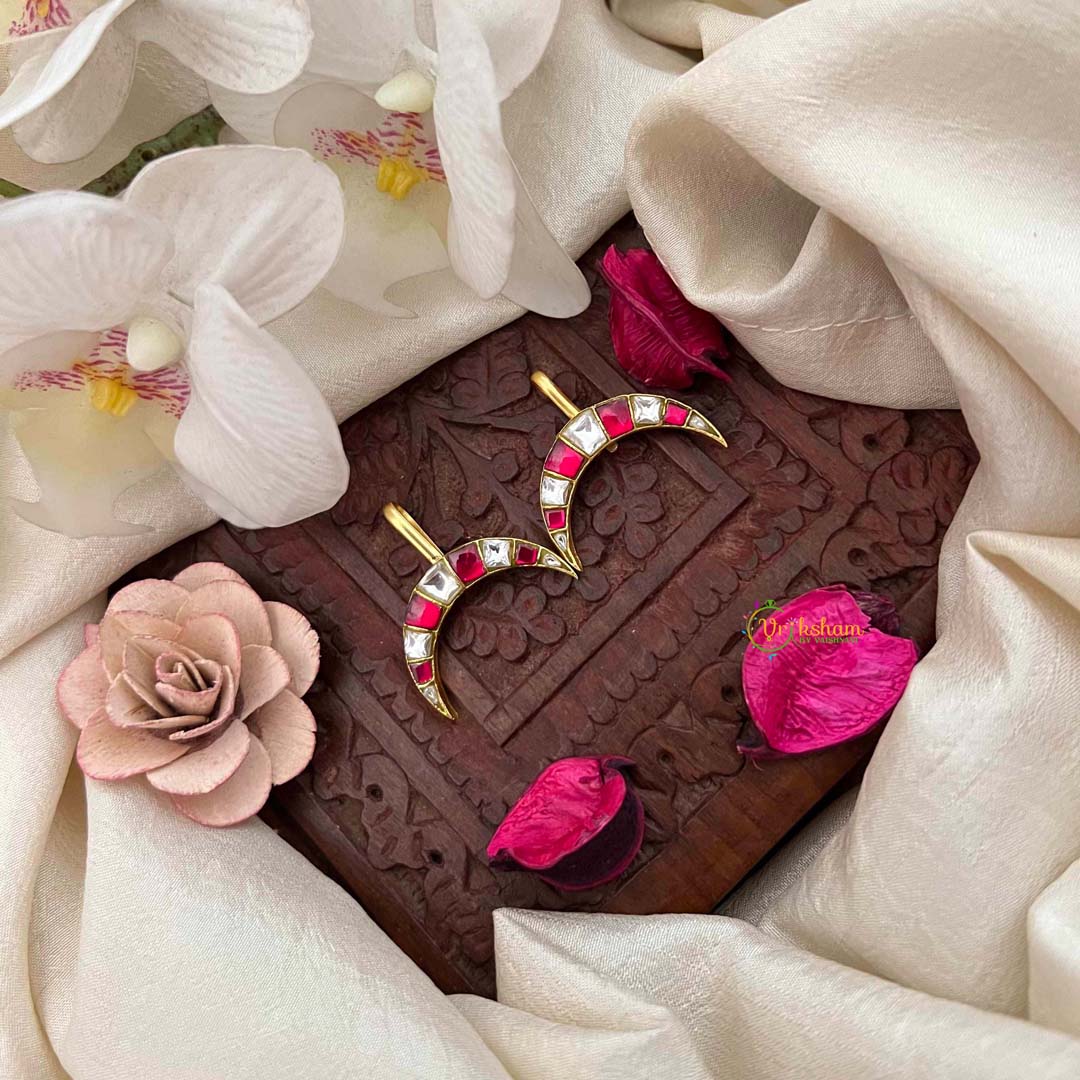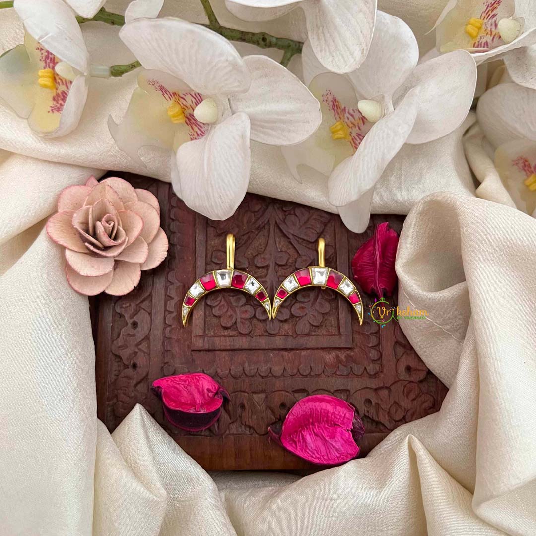 Discover refined elegance with this Half Moon Style Kundan Jadau Bugadi, a graceful interpretation of traditional artistry in white and red. The crescent motif, steeped in symbolic meaning, is rendered through exquisite Kundan craftsmanship with meticulous attention to detail. The harmonious interplay of pristine white and deep red creates a sophisticated aesthetic that balances boldness with restraint. Authentic Jadau techniques ensure each stone is securely positioned, guaranteeing both beauty and longevity. Ideal for bridal occasions, festive celebrations, and cherished moments, this bugadi elevates any ensemble with understated opulence. A distinguished accessory that honors heritage artistry while embodying contemporary grace, making it a treasured addition to any jewelry collection.