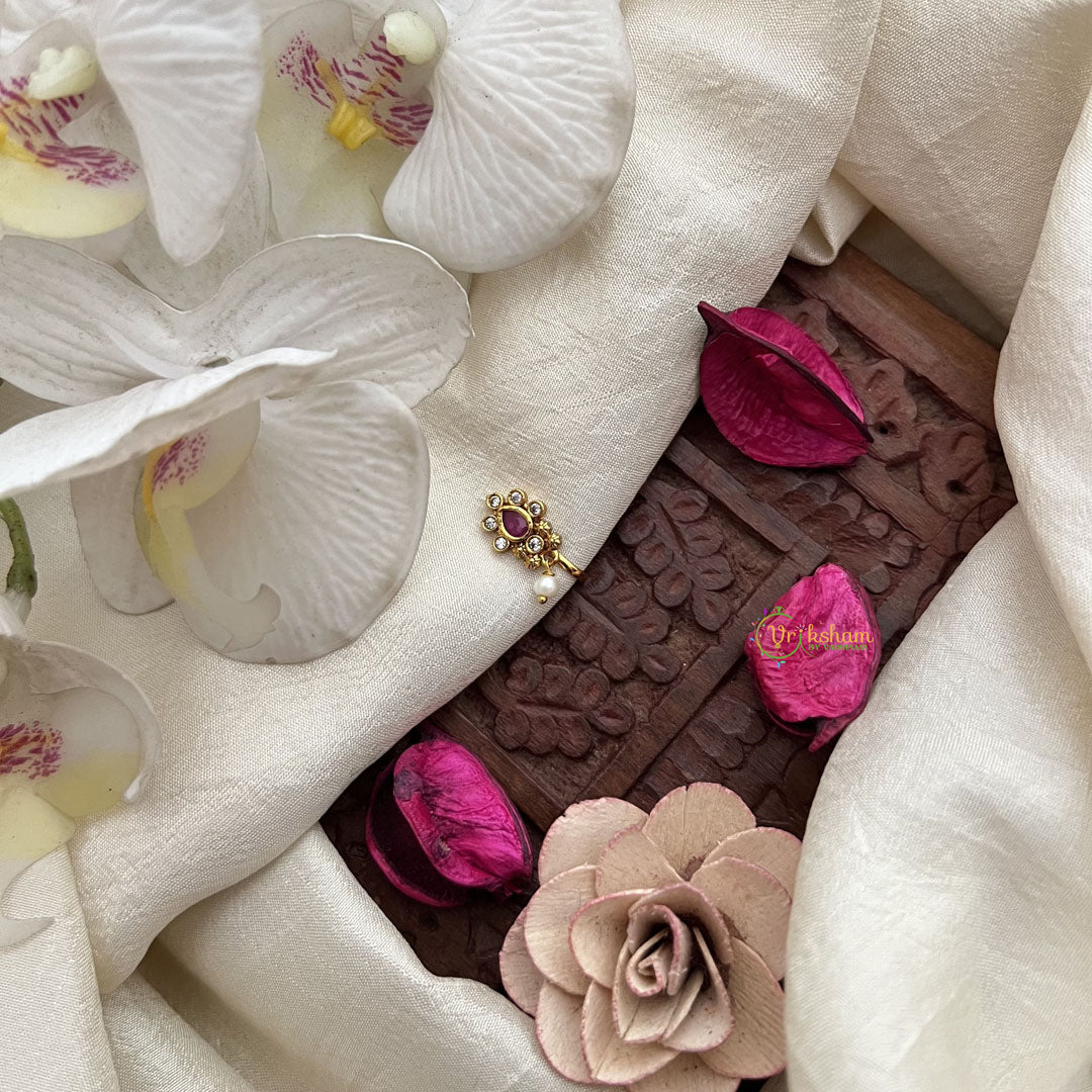 The Vriksham Elegant Indian Nath showcases a harmonious blend of red and white gemstones paired with delicate pearls. This press-fit nose pin combines traditional artistry with comfortable wear, adding a refined and graceful touch to your look. Ideal for special occasions, it elevates your ensemble with understated sophistication.