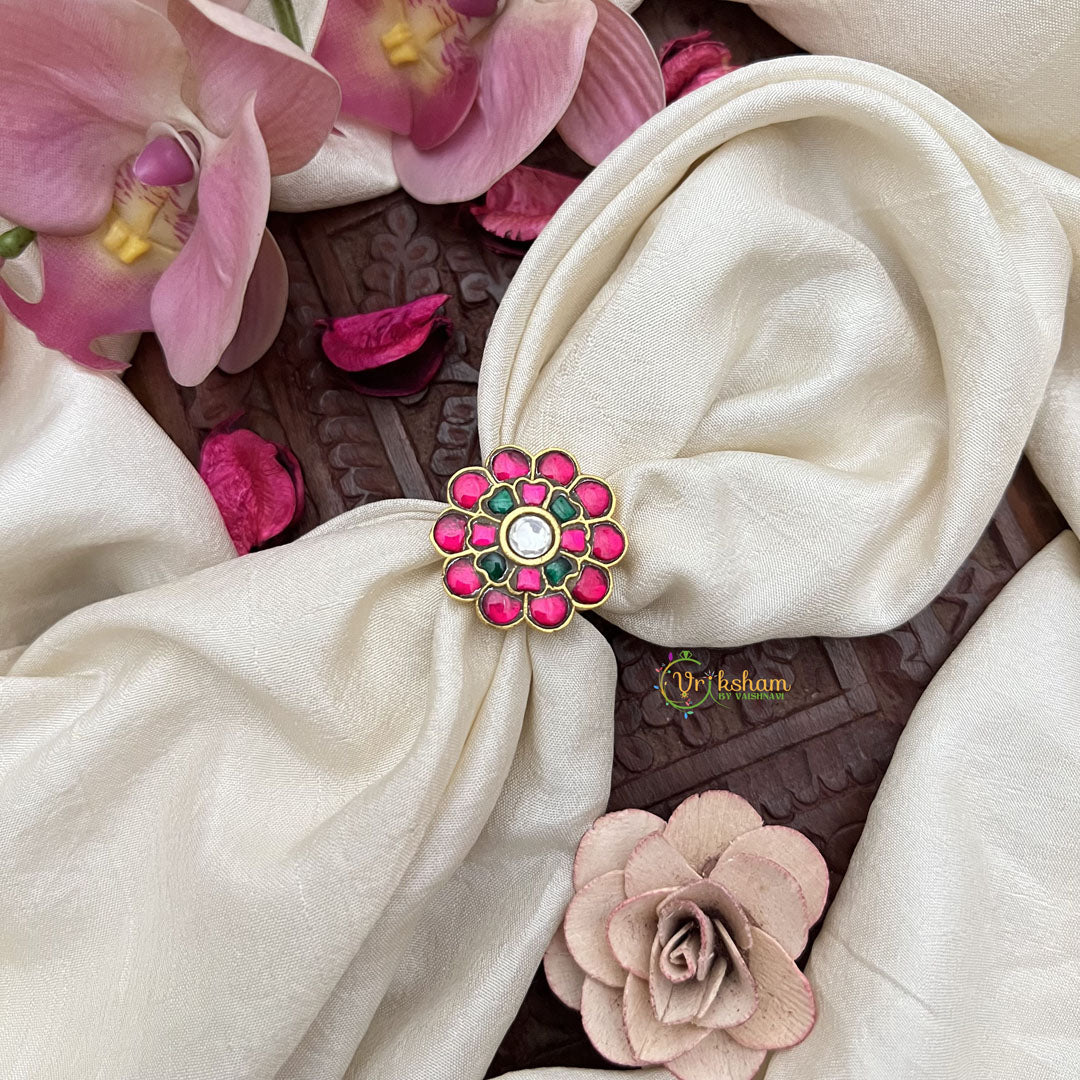 The Vriksham Elegant Jadau Kundan Floral Finger Ring in white, red, and green beautifully captures intricate floral artistry with fine kundan detailing. This sophisticated ring adds a touch of timeless elegance and vibrant color, perfect for enhancing your traditional and festive ensembles.