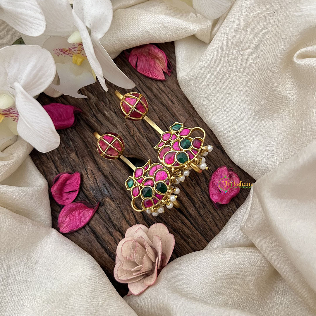 Discover refined beauty with the Vriksham Elegant Kemp Chandbali Ear Cuff Bugadi, adorned with lustrous pearls. This handcrafted piece features classic chandbali motifs enriched with traditional Kemp stones, offering a perfect balance of heritage and grace. Designed to sit comfortably on your ear, it adds a subtle yet striking statement to any ensemble, ideal for those who appreciate timeless elegance and delicate craftsmanship.