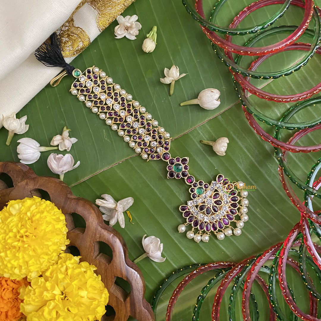 Add a touch of sophistication to your ensemble with the Vriksham Elegant Kemp Mang Tikka. The intricate design of red, green, and white kemp stones, paired with the lustrous pearls, exudes luxury and exclusivity. Elevate your look and make a statement with this stunning piece.