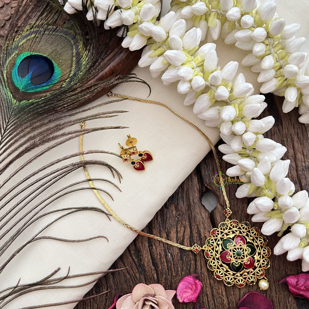 The Vriksham Traditional Palakka Floral Pendant Neckpiece features a beautifully crafted floral pendant that captures the essence of Kerala’s traditional artistry. Its elegant design and intricate detailing make it a refined accessory, perfect for enhancing both ethnic and contemporary outfits. This neckpiece offers a sophisticated touch of heritage and style for any special occasion.