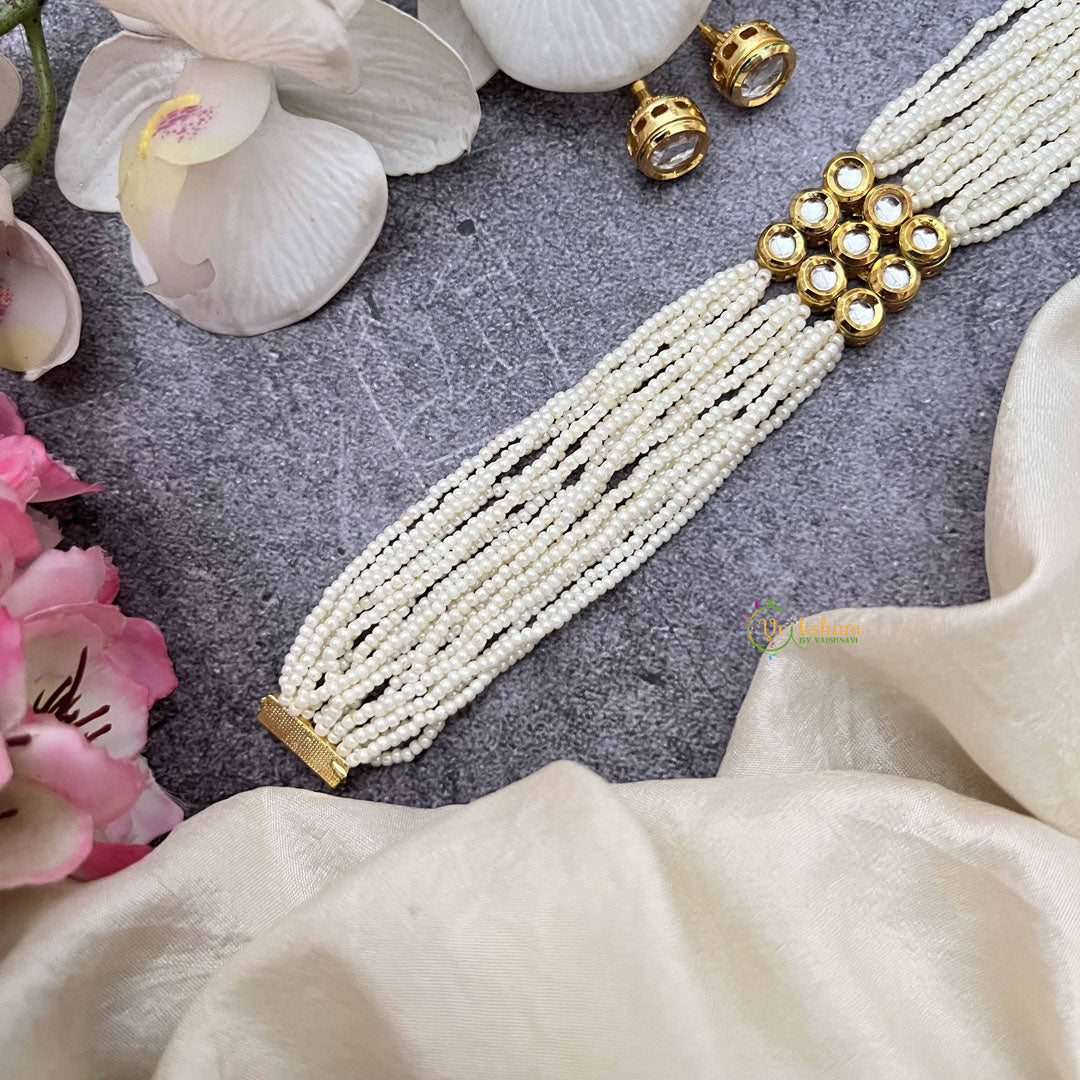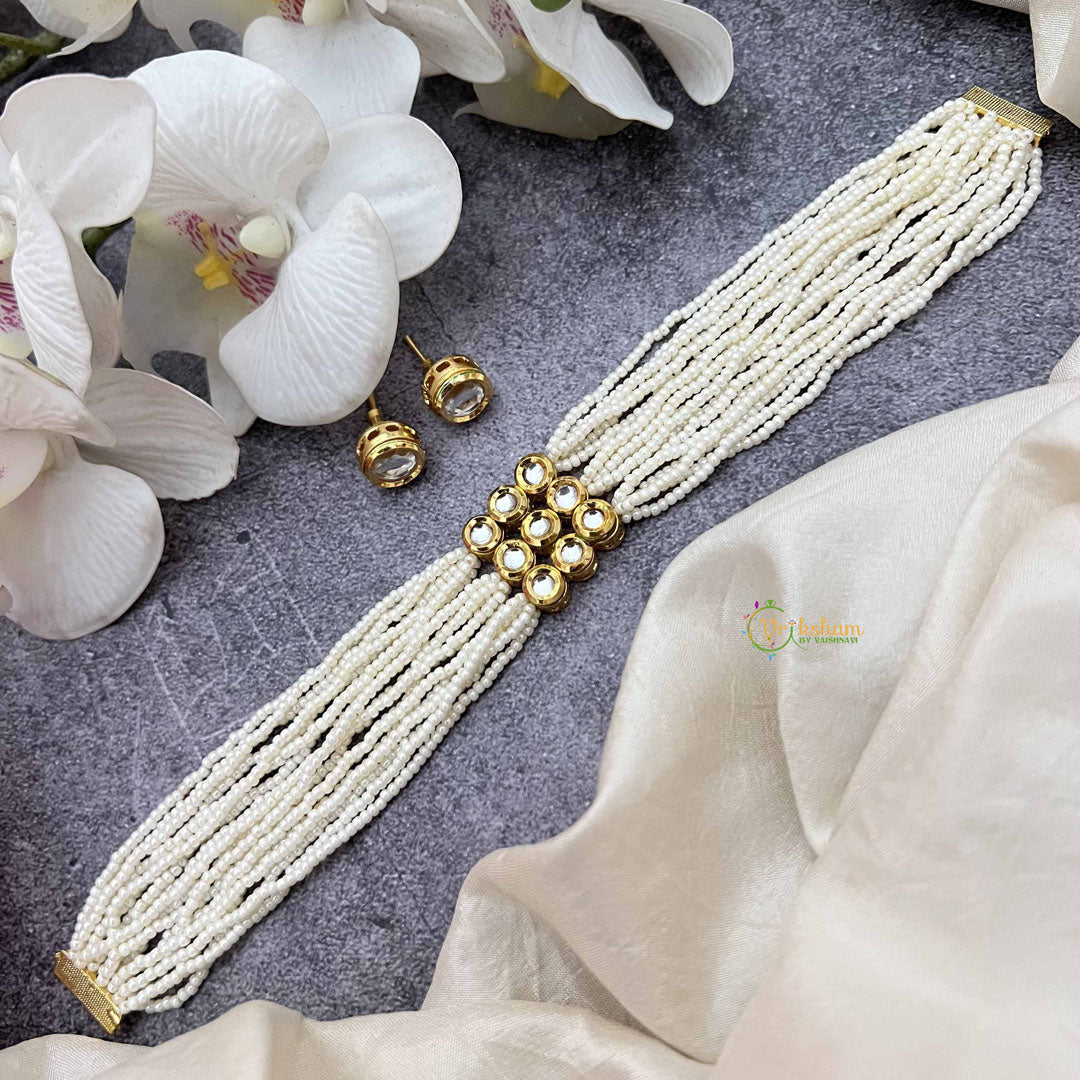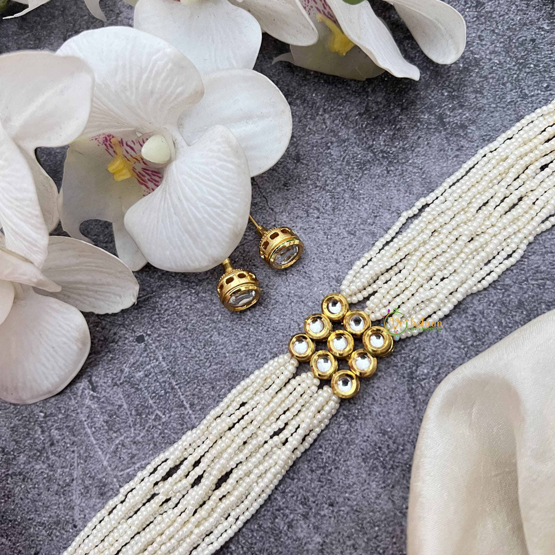The Vriksham Elegant Kundan Square Pendant Necklace features a striking square pendant complemented by multilayered pearl strands. This sophisticated design seamlessly blends classic Kundan artistry with timeless elegance, making it an ideal accessory for refined occasions.
