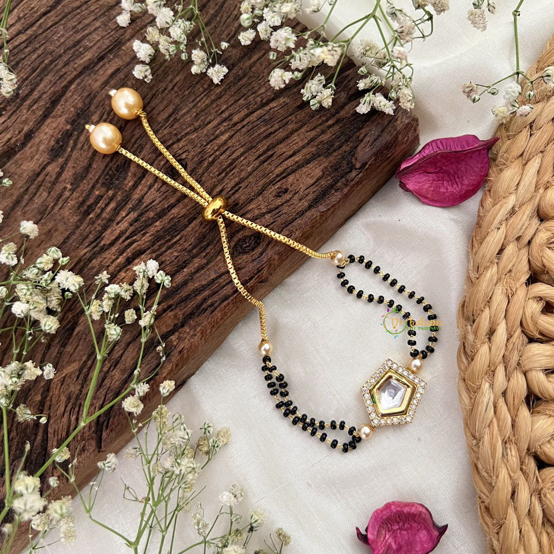 The Vriksham Elegant Kundan Style CZ Charm Mangalsutra Bracelet features a delicate charm adorned with sparkling cubic zirconia stones set in traditional Kundan style. This sophisticated bracelet blends classic craftsmanship with modern elegance, adding a subtle yet refined sparkle to your look. Ideal for both special occasions and everyday grace.