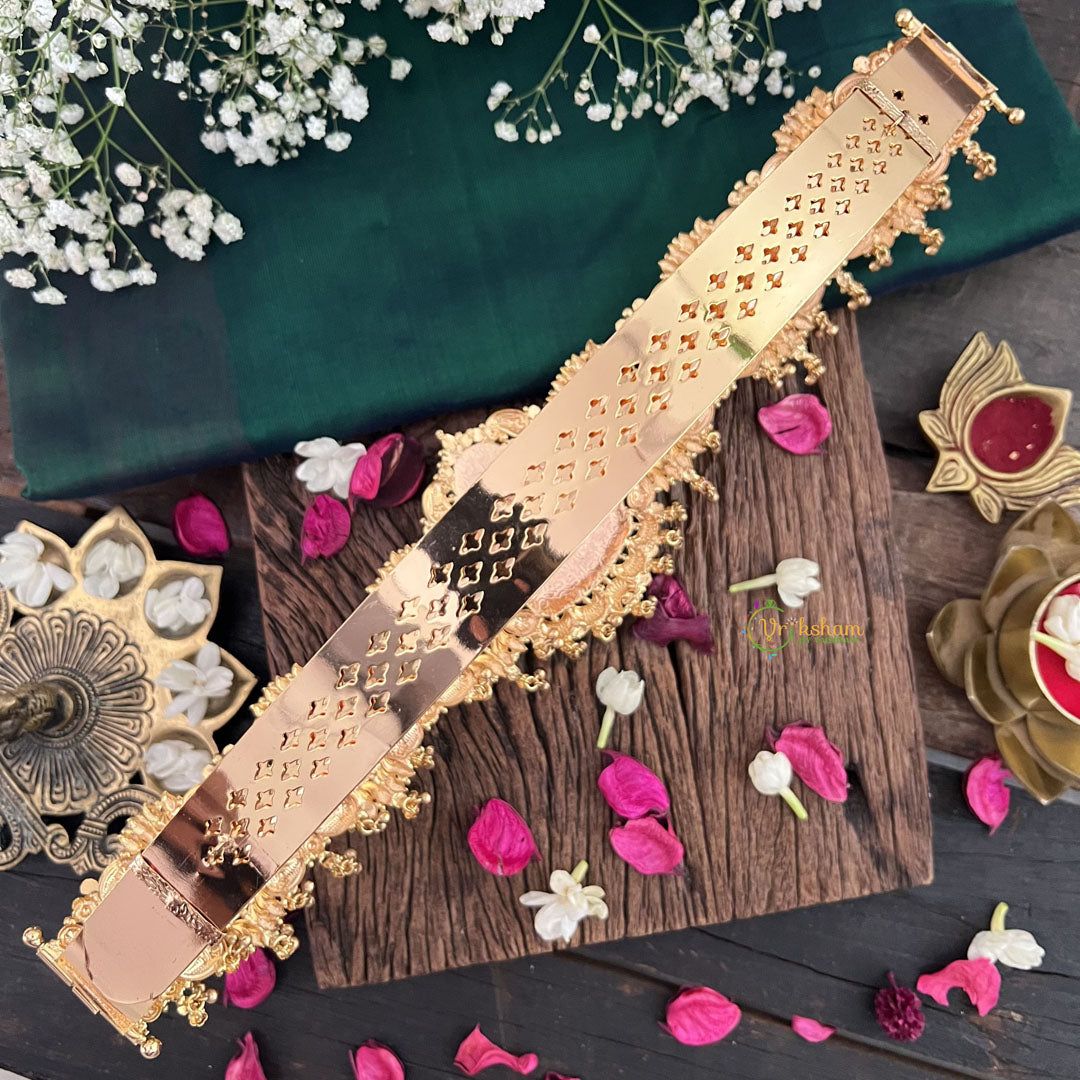 Effortlessly elevate your style with our Vriksham Elegant Lakshmi Coin Pendant Hipbelt. Handcrafted with intricate details and a stunning Lakshmi coin pendant, this hipbelt exudes luxury and sophistication. Make a statement at any occasion with this timeless piece that adds a touch of elegance to any outfit.