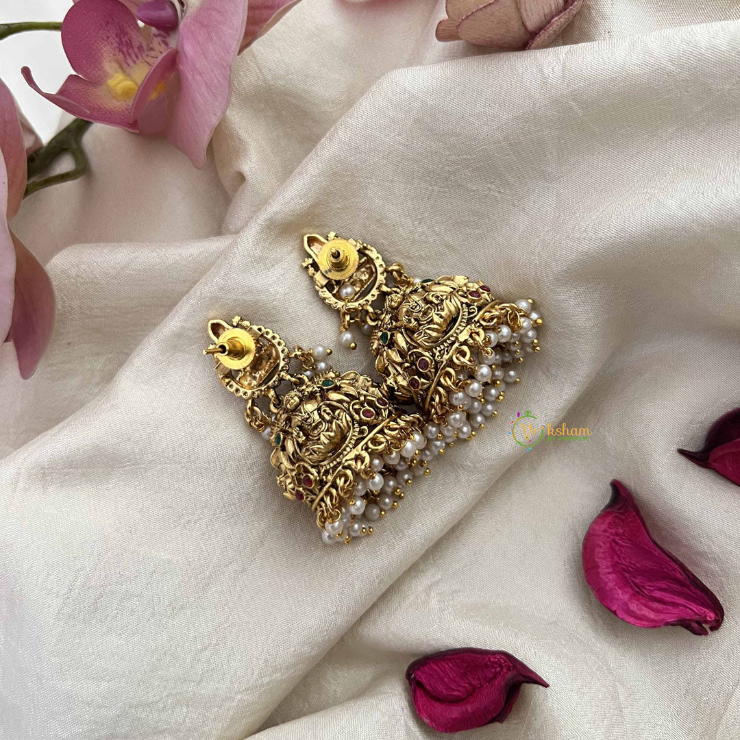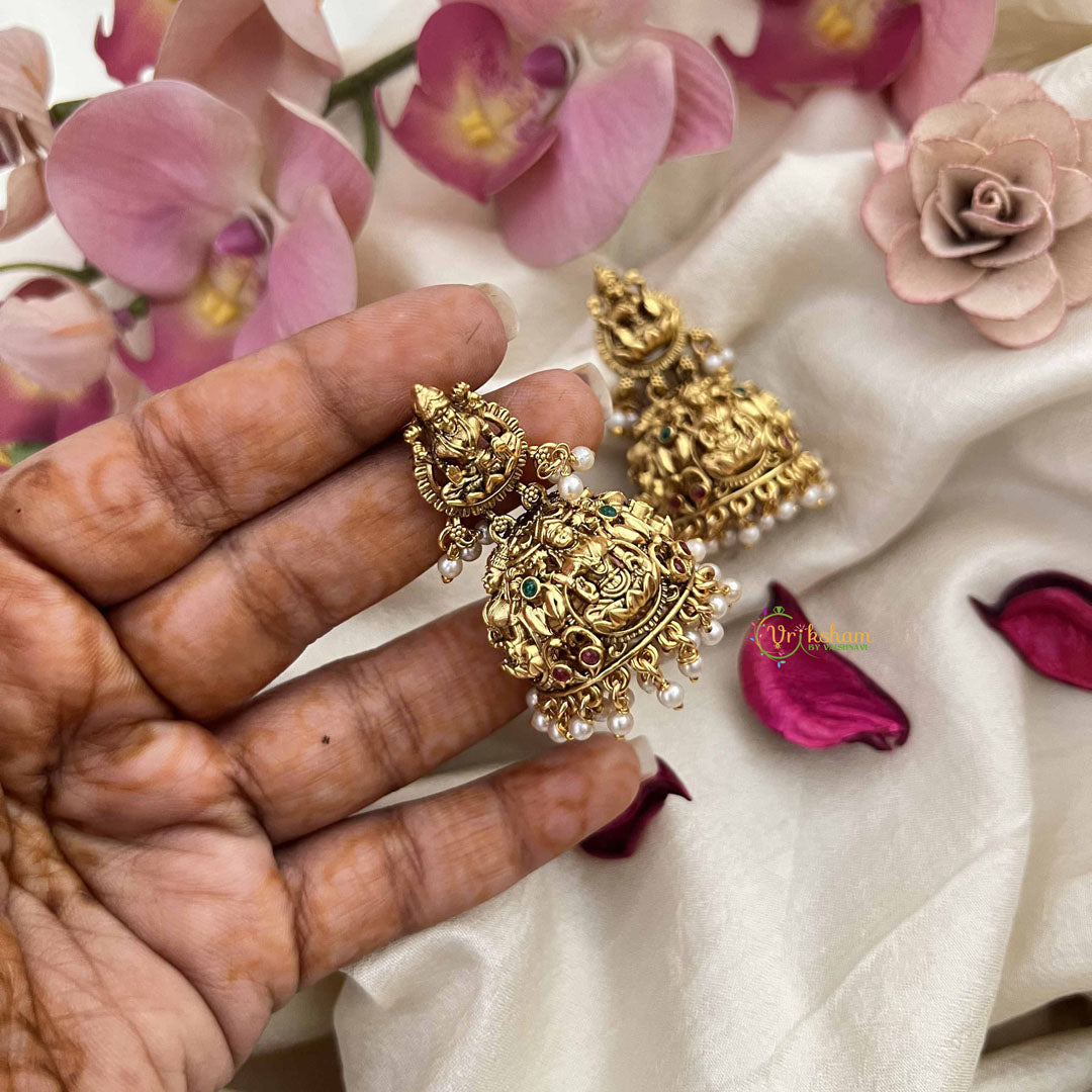 Embrace divine elegance with these Lakshmi-inspired dome jhumka earrings, radiating timeless beauty through their luxurious gold-look finish. Adorned with lustrous pearls and complemented by rich red and green gemstone accents, these earrings embody the grace and prosperity associated with the goddess herself. The ornate dome design showcases intricate detailing that catches light magnificently, while the harmonious color palette adds depth and cultural richness to your ensemble. Perfect for auspicious occasions, festivals, and celebrations, these sophisticated jhumkas serve as a meaningful expression of tradition and refined taste. A treasured piece that honors heritage while making a striking statement.