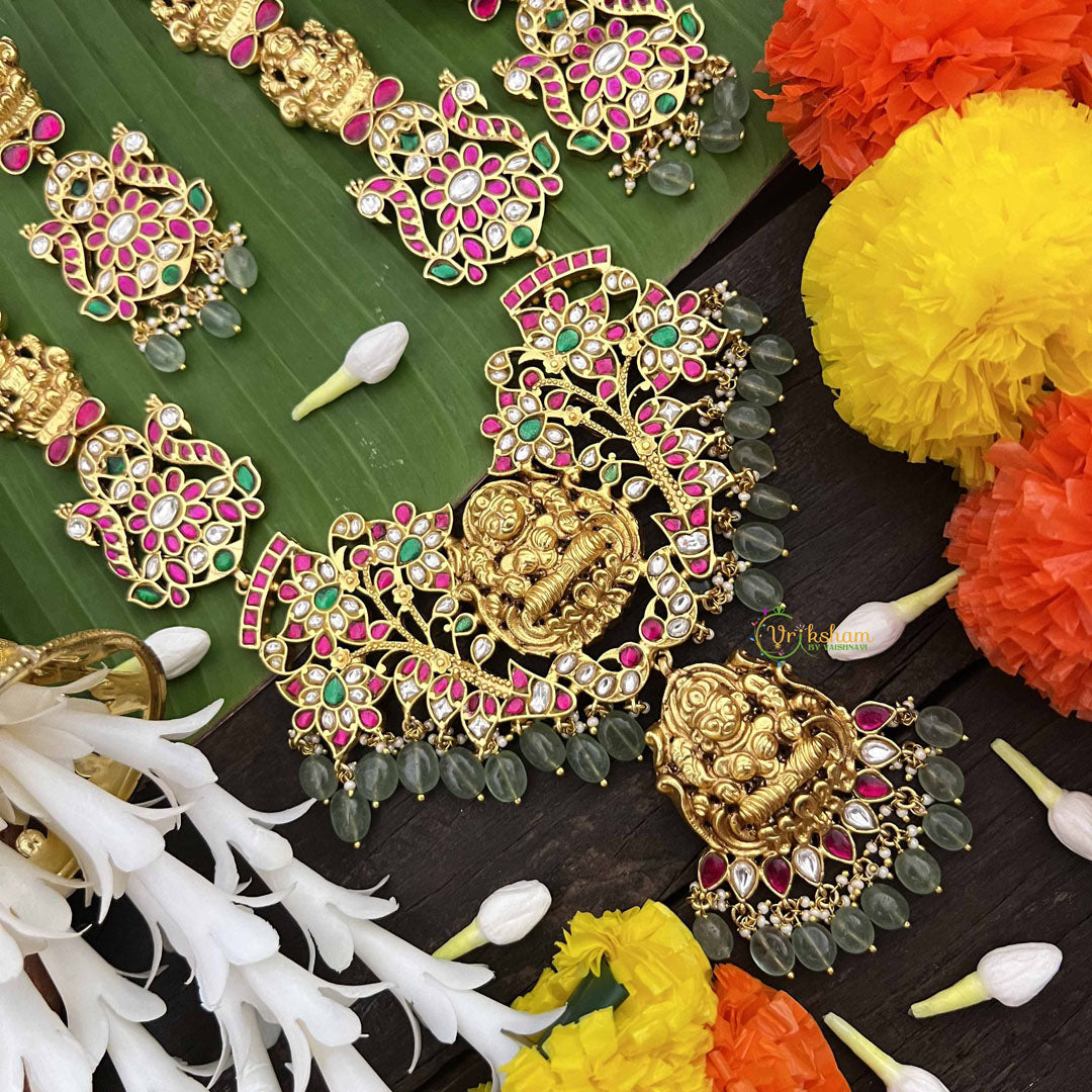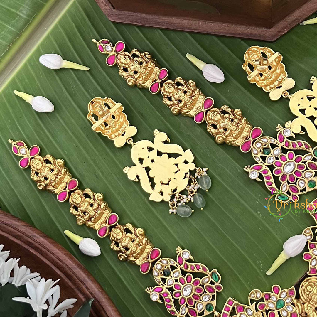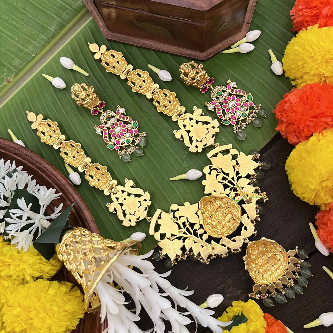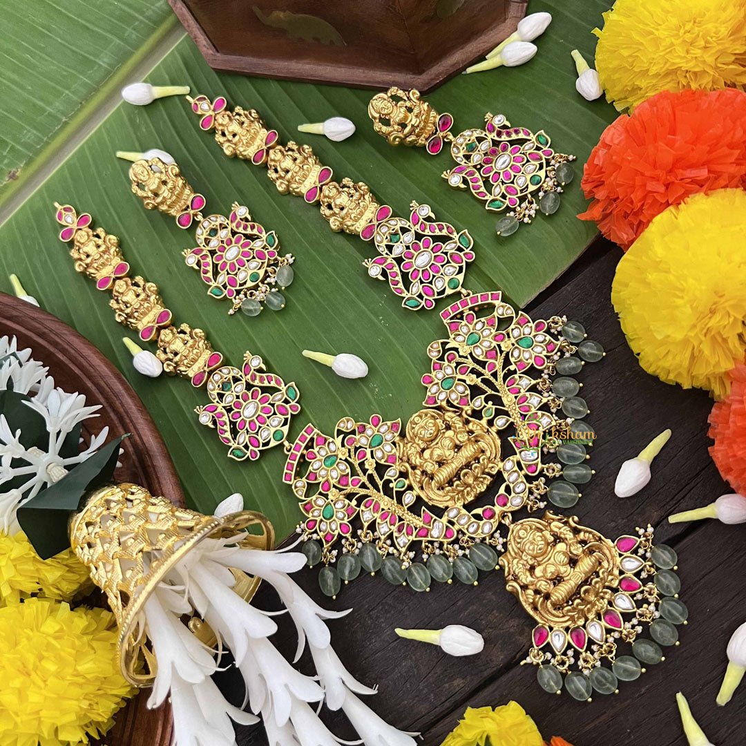 Discover divine elegance with this Lakshmi Idol long neckpiece, a luminous testament to sacred artistry and refined craftsmanship. The revered Lakshmi pendant, embellished with delicate floral Kundan Jadau detailing, symbolizes abundance and spiritual grace. Suspended from a sophisticated arrangement of crimson, emerald, and pearl-white stones punctuated by verdant green beads, this neckpiece creates an aura of timeless beauty. Ideal for those who honor tradition while embracing contemporary style, it seamlessly transitions from festive celebrations to spiritual occasions, serving as both a meaningful devotional piece and an exquisite jewelry investment.