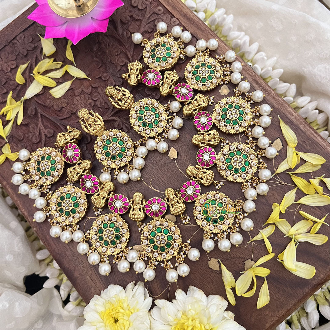 Discover refined elegance with the Vriksham Elegant Lakshmi with Coin Style Jadau Kundan Short Neckpiece. Featuring intricate kundan and jadau artistry, this piece highlights a striking Lakshmi motif paired with coin-inspired accents. Designed as a short neckpiece, it offers a graceful blend of tradition and sophistication, perfect for enhancing your look at formal and festive occasions.