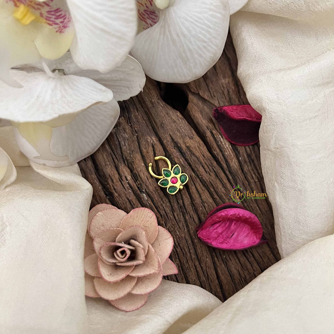 The Vriksham Elegant Leaf Style Golden Kundan Jadau Septum Ring features a gold-toned finish exquisitely decorated with red and green stones. Its detailed leaf design combines traditional craftsmanship with sophisticated elegance, creating a graceful accessory that elevates any ensemble with timeless beauty.