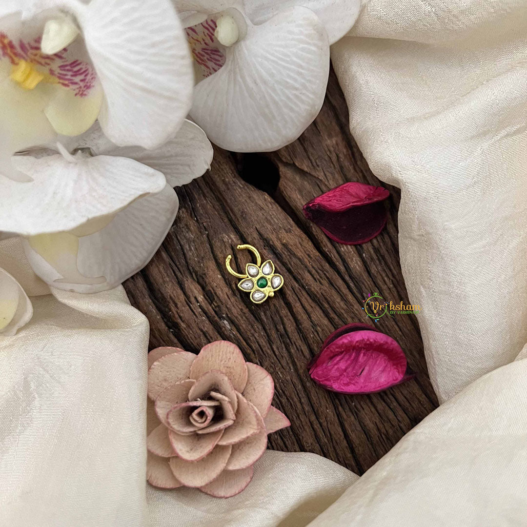 The Vriksham Elegant Leaf Style Golden Kundan Jadau Septum Ring features a gold-toned finish adorned with white and green stones. Its intricate leaf design blends refined craftsmanship with elegant details, creating a sophisticated accessory that adds a graceful and timeless touch to any ensemble.