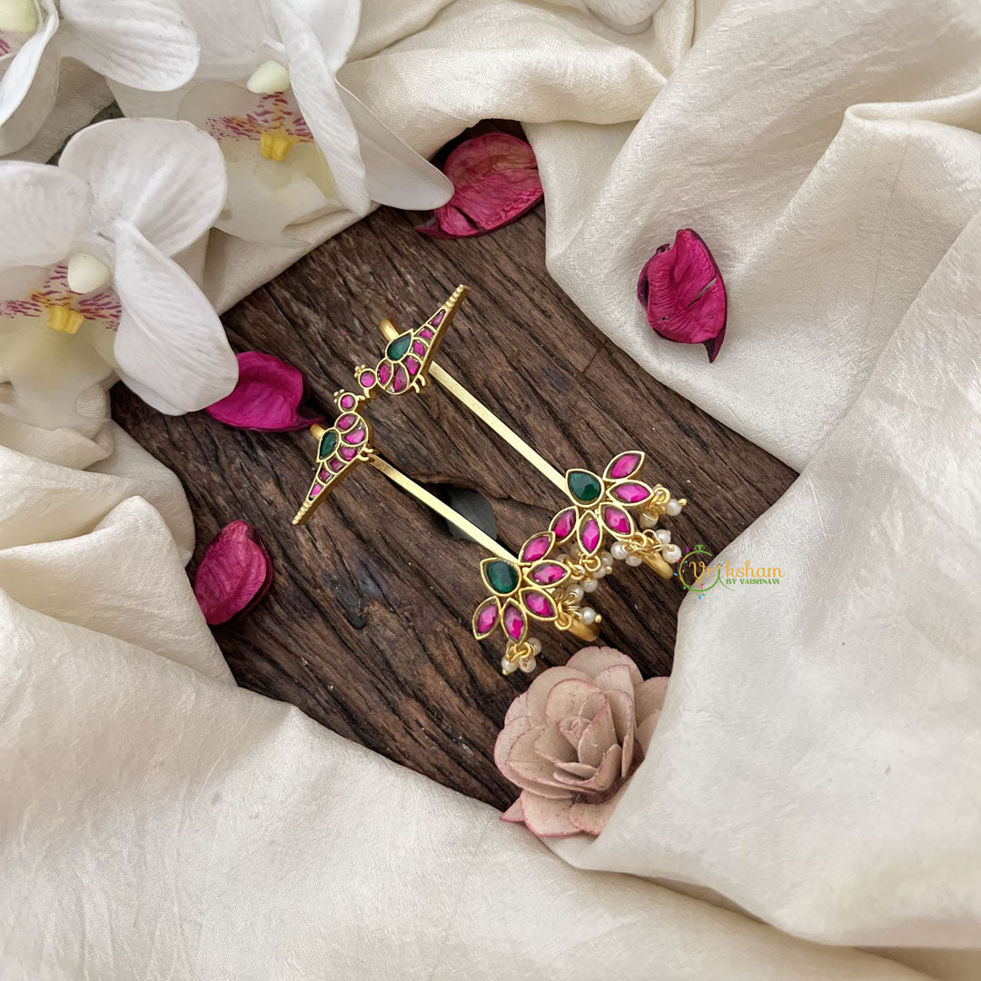 The Vriksham Elegant Lotus Parrot Ear Cuffs with Pearls combine intricate floral and avian motifs with the subtle glow of pearls. This exquisite design brings a refined and graceful accent to any ensemble, blending artistry with sophistication. Perfect for adding an elegant statement to traditional or modern styles without requiring piercings.