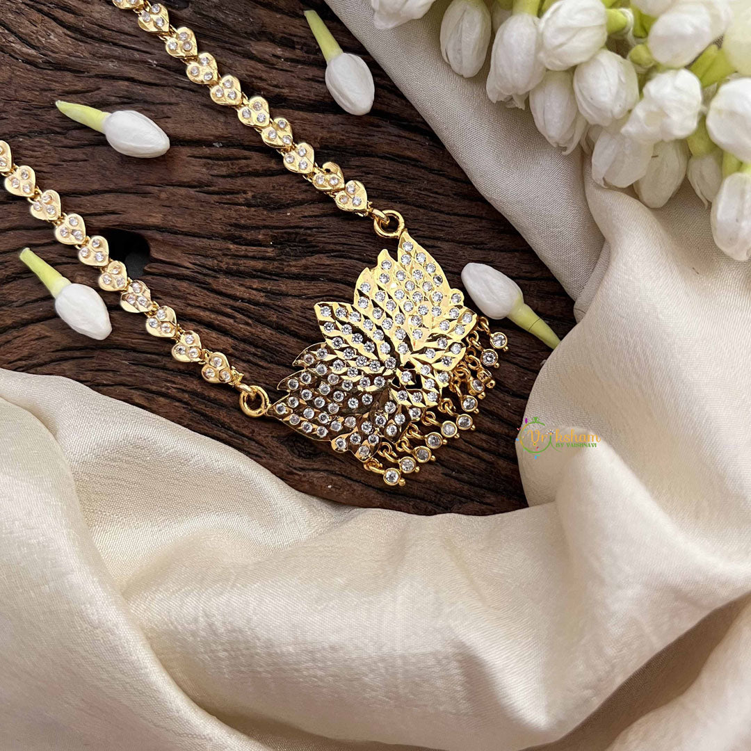 Experience serene sophistication with this Elegant Lotus White Trio pendant, a masterpiece of refined artistry and spiritual grace. This exquisite design showcases three delicately rendered lotus blooms complemented by heart-shaped layering that adds tender dimension and visual poetry. Adorned with shimmering AD stone accents, each element creates a harmonious composition that celebrates natural beauty and contemplative elegance. The gold-plated setting radiates warm luxury, while the pristine white mala embodies clarity, peace, and spiritual awakening. Meticulously designed for the discerning individual, this pendant transcends conventional jewelry to become a personal sanctuary of meaning and beauty. Perfect for meditation, daily wear, or cherished moments, it represents the qualities of purity, transformation, and refined grace—a distinguished accessory that honors your inner journey and your appreciation for timeless, spiritually resonant design.