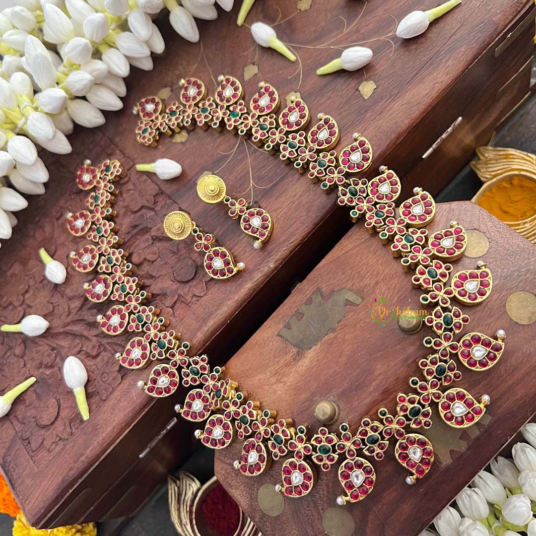 Add a touch of elegance to your ensemble with the Vriksham Gold Look Alike Floral Addigai Neckpiece. Featuring a beautiful floral design in a mix of red and green, this short neckpiece adds a pop of color to any outfit. Made from high-quality materials, it exudes luxury and sophistication.