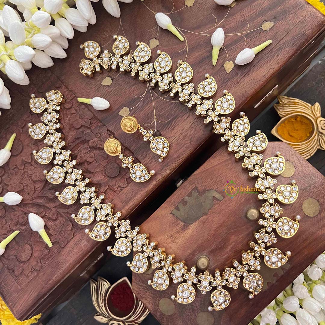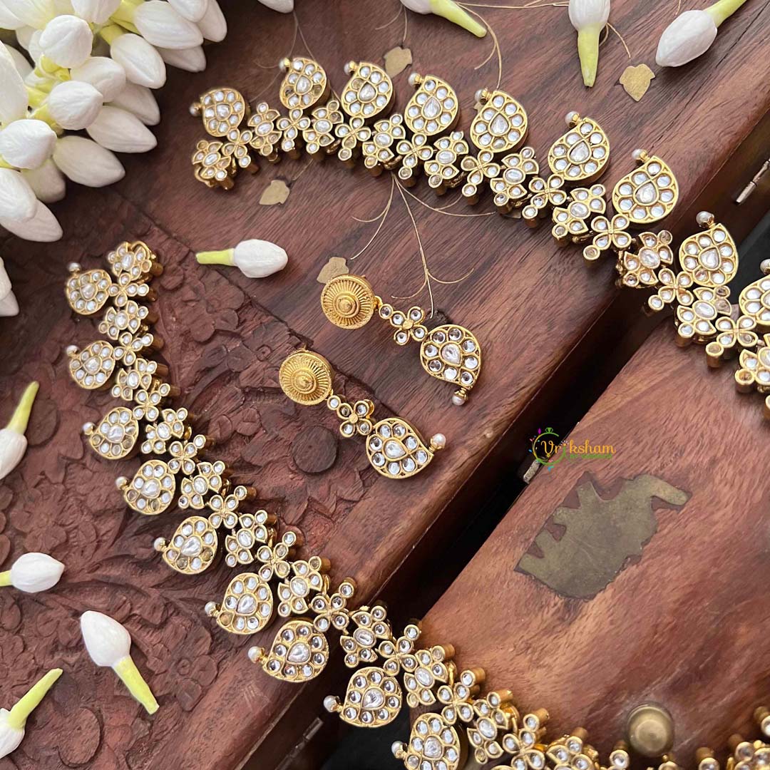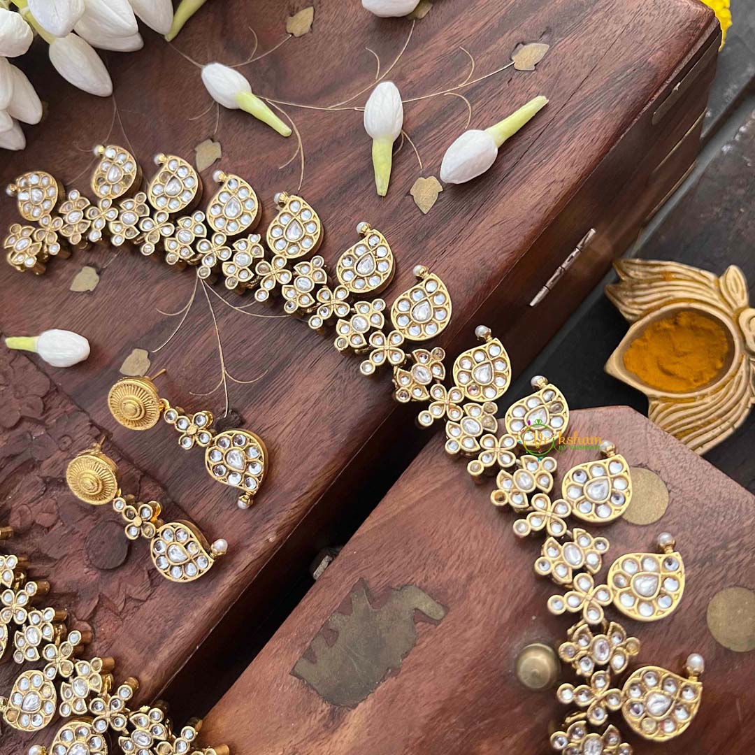 Celebrate regal heritage with this Antique Nakshi Gandaberund Kundan Jadau neckpiece, a magnificent embodiment of classical Indian jewelry mastery. The gandaberund motif—symbolizing divine protection and prosperity—is rendered through intricate nakshi work and adorned with scintillating kundan stones that radiate timeless brilliance. Delicate rice pearls are thoughtfully interspersed throughout, creating luminous accents that enhance the composition's ethereal quality. The guttapusalu technique showcases meticulous craftsmanship at its finest, with each element precisely positioned for maximum visual impact and graceful movement. This extended neckpiece drapes with regal poise, making it an exceptional choice for brides seeking heirloom-quality jewelry. A sophisticated accessory that honors centuries of artisanal tradition with enduring elegance and cultural significance.