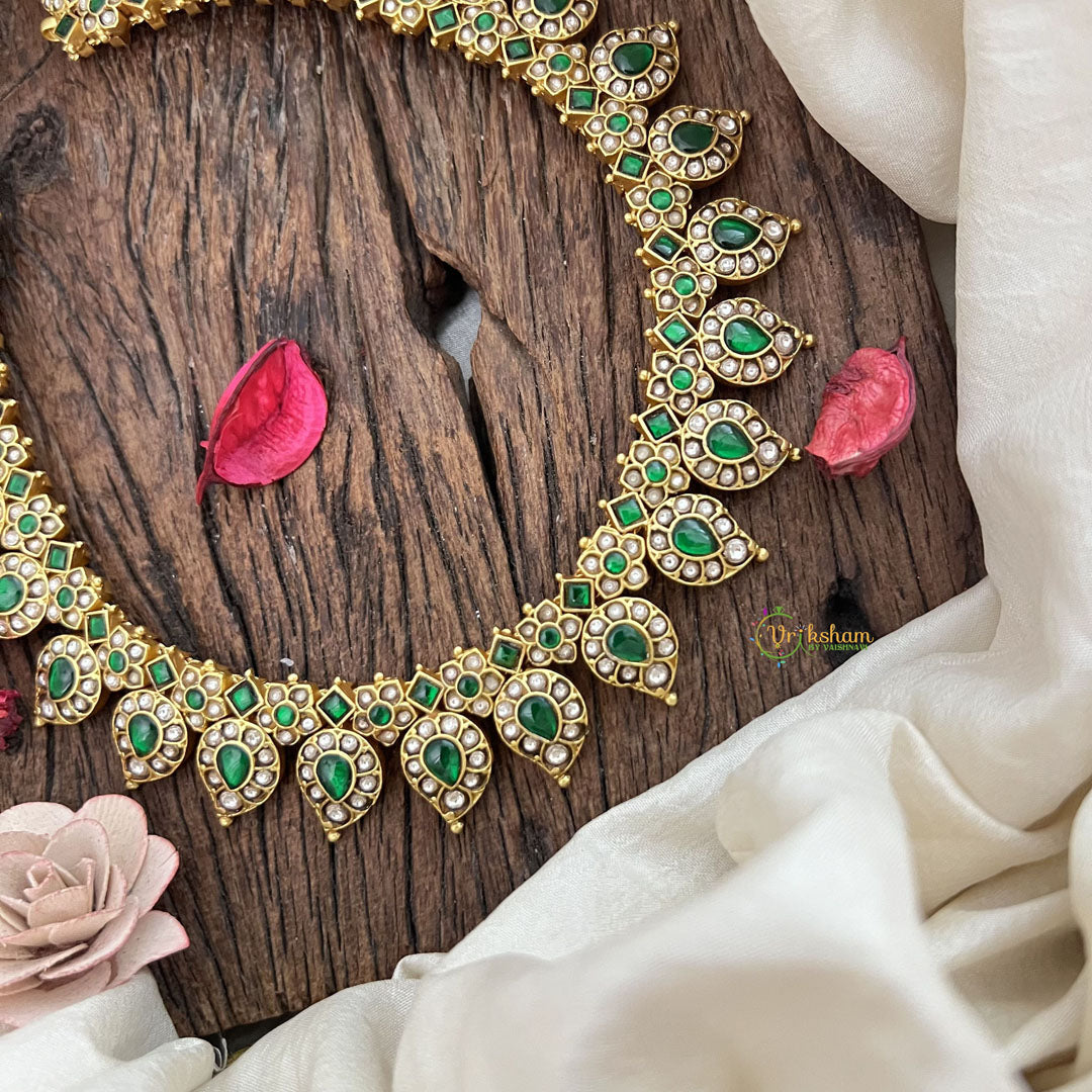 The Vriksham Elegant Manga Style Jadau Short Neckpiece in green and white showcases refined craftsmanship with its classic Jadau design. This short neckpiece combines the elegance of traditional Manga style with a harmonious blend of green and white tones, making it an ideal accessory for sophisticated occasions. Its delicate detailing enhances any outfit with subtle grace and timeless charm.