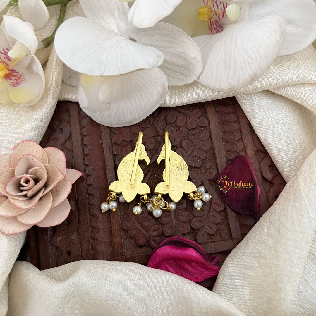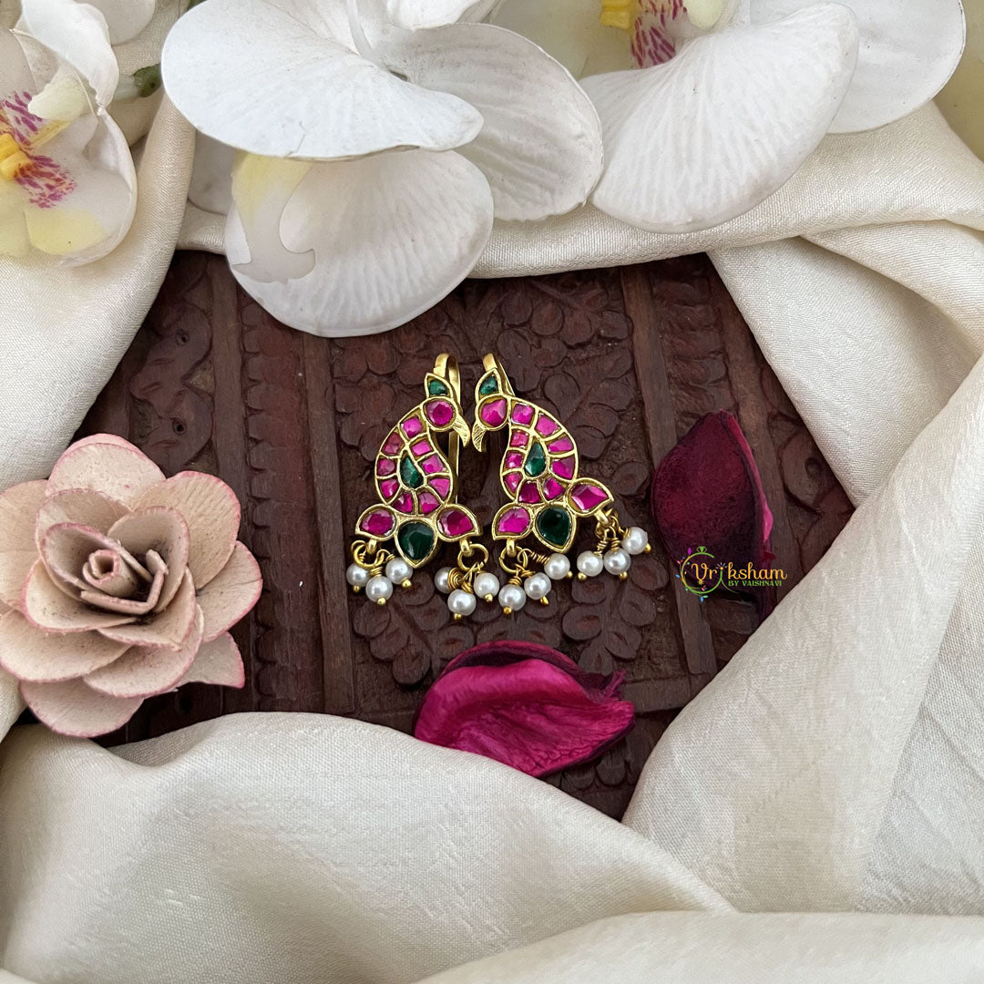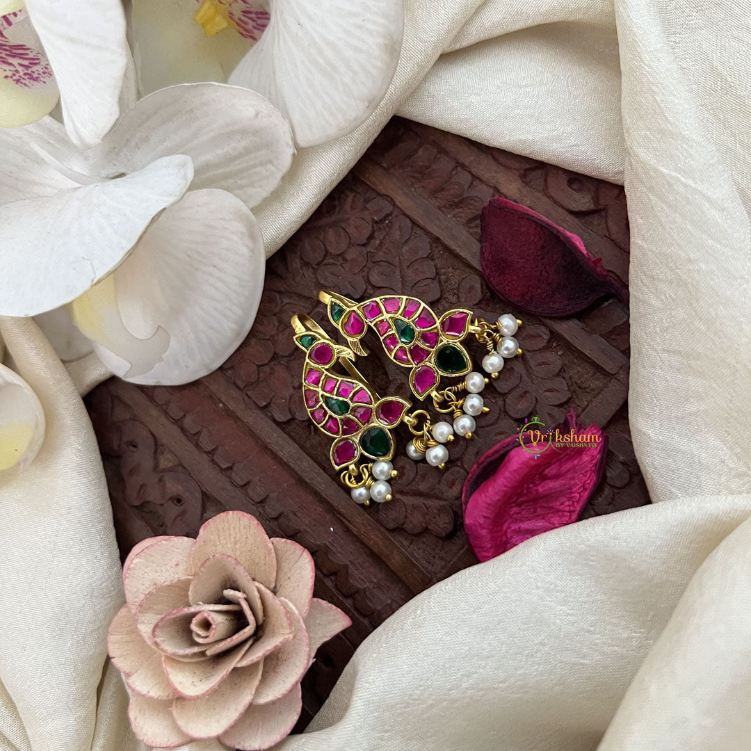 The Vriksham Elegant Mayura Kundan Jadau Press Bugadi in green and red, accented with pearls, features a refined peacock-inspired design crafted with intricate kundan and jadau work. This sophisticated accessory adds a timeless elegance to traditional attire, perfect for enhancing your look on special occasions with graceful charm.
