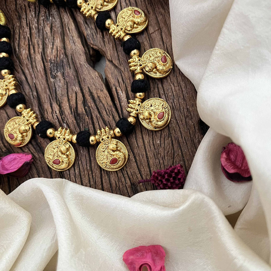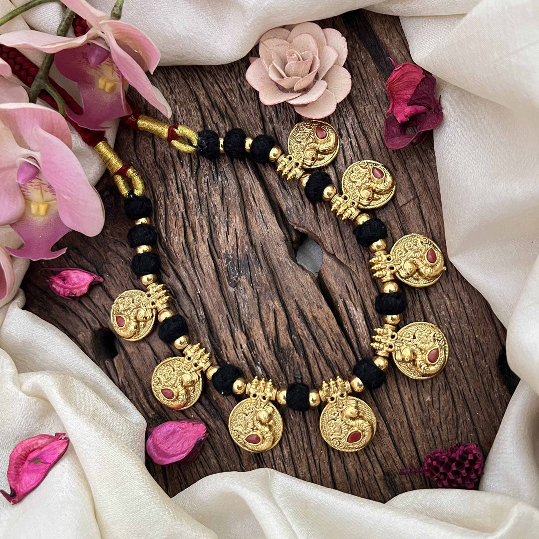 Discover refined elegance with this gold-plated AD floral coin short neckpiece, a jewel that celebrates vibrant tradition. Adorned with intricately carved floral coins and embellished with sparkling AD stones in captivating red, white, and green tones, this piece radiates festive sophistication. The premium gold plating ensures lasting lustre and durability, while the short length offers comfortable, versatile styling for various occasions. Each floral detail is meticulously crafted to showcase authentic artisanal excellence, making this neckpiece a standout accessory for celebrations, weddings, and cultural events. Whether paired with traditional attire or contemporary ensembles, this jewelry piece brings an air of refined grace and timeless beauty to any wardrobe.