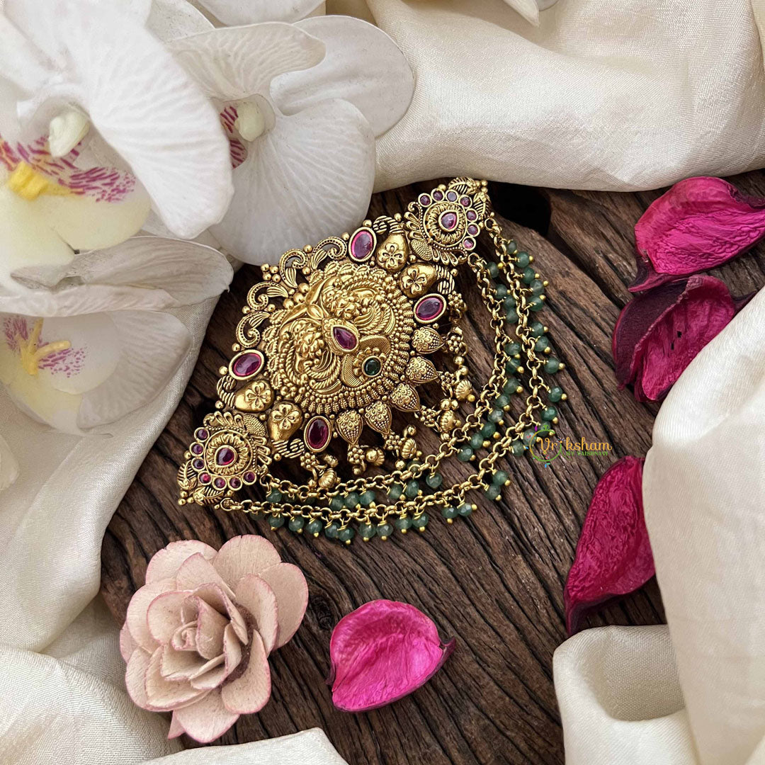 Enhance your look with the Vriksham Elegant Peacock Gold Look Alike Hair Clip, beautifully detailed with red and green accents and a striking green drop. This finely crafted accessory merges traditional peacock motifs with a gold-tone finish, offering a sophisticated touch to any hairstyle. Perfect for festive occasions, it adds vibrant color and elegance while securely holding your hair in place.