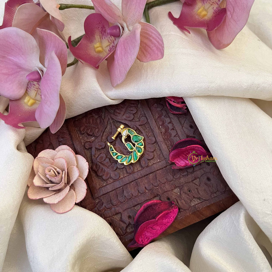 The Vriksham Elegant Peacock Nath features a refined blend of green and white stones, meticulously crafted in traditional Jadau style. Its elegant peacock design with secure press-fit offers both comfort and grace, adding a distinguished touch to your ethnic ensemble.