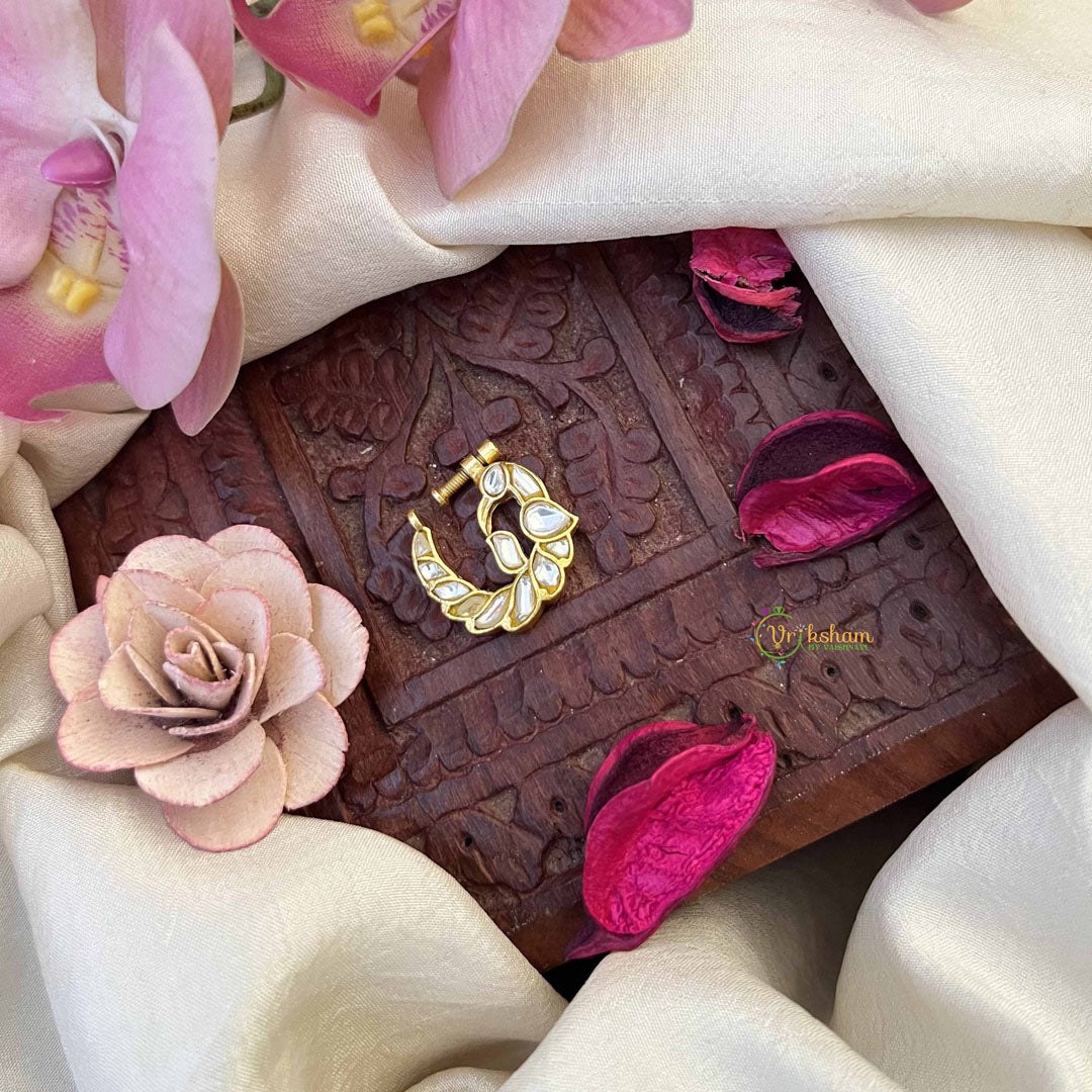 The Vriksham Elegant Peacock Nath features a refined combination of white and red stones set in intricate Jadau craftsmanship. Its delicate peacock design with a secure press-fit ensures both elegance and comfort, making it an ideal accessory to enhance your traditional ensemble.