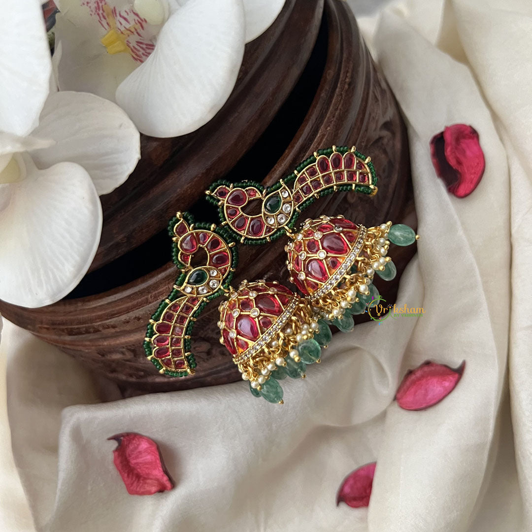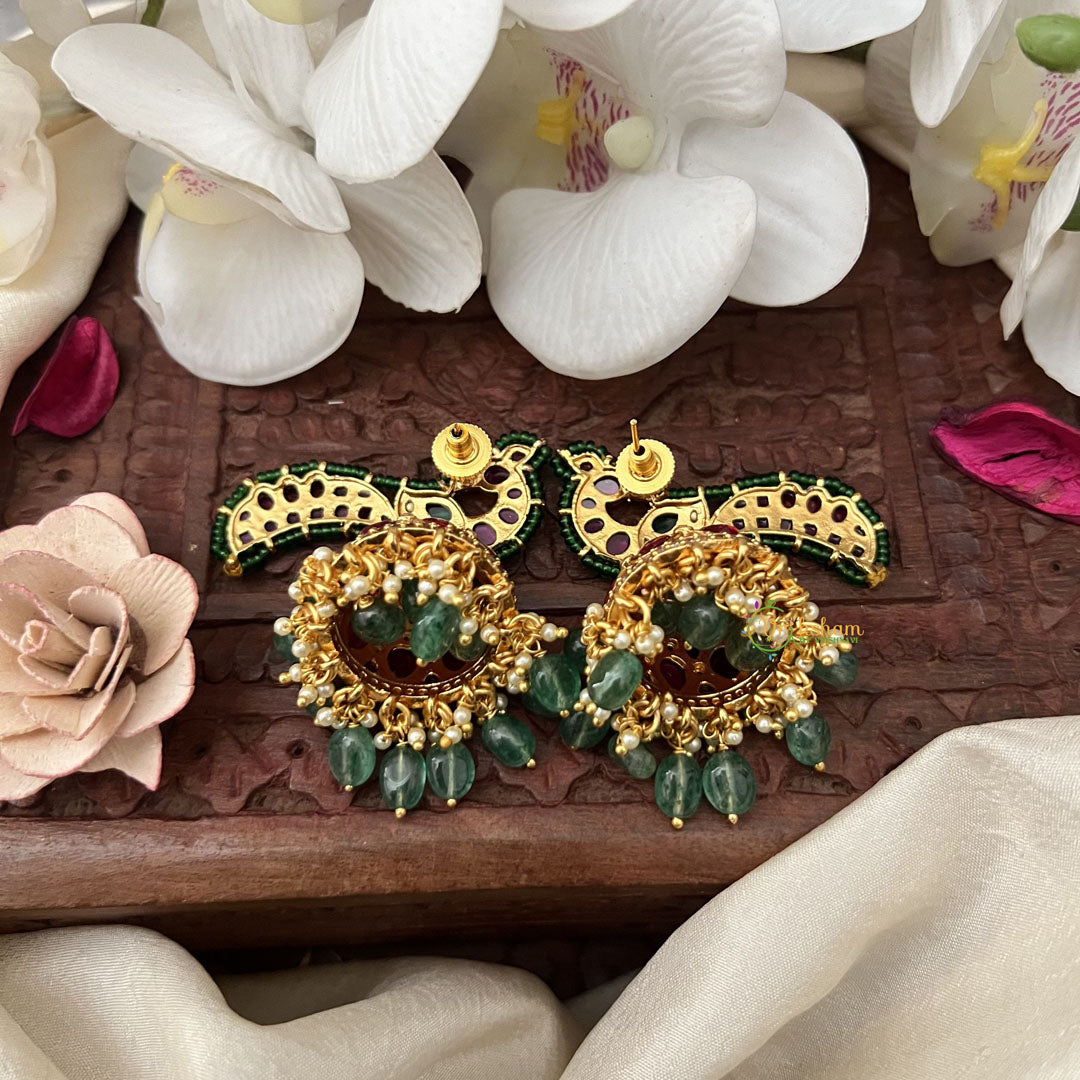 Exquisitely crafted Peacock Jhumkas featuring delicate red and green beads. These elegant earrings blend traditional motifs with contemporary design, creating a refined statement piece. The subtle color palette ensures versatility, complementing both casual and formal attire with sophisticated charm.