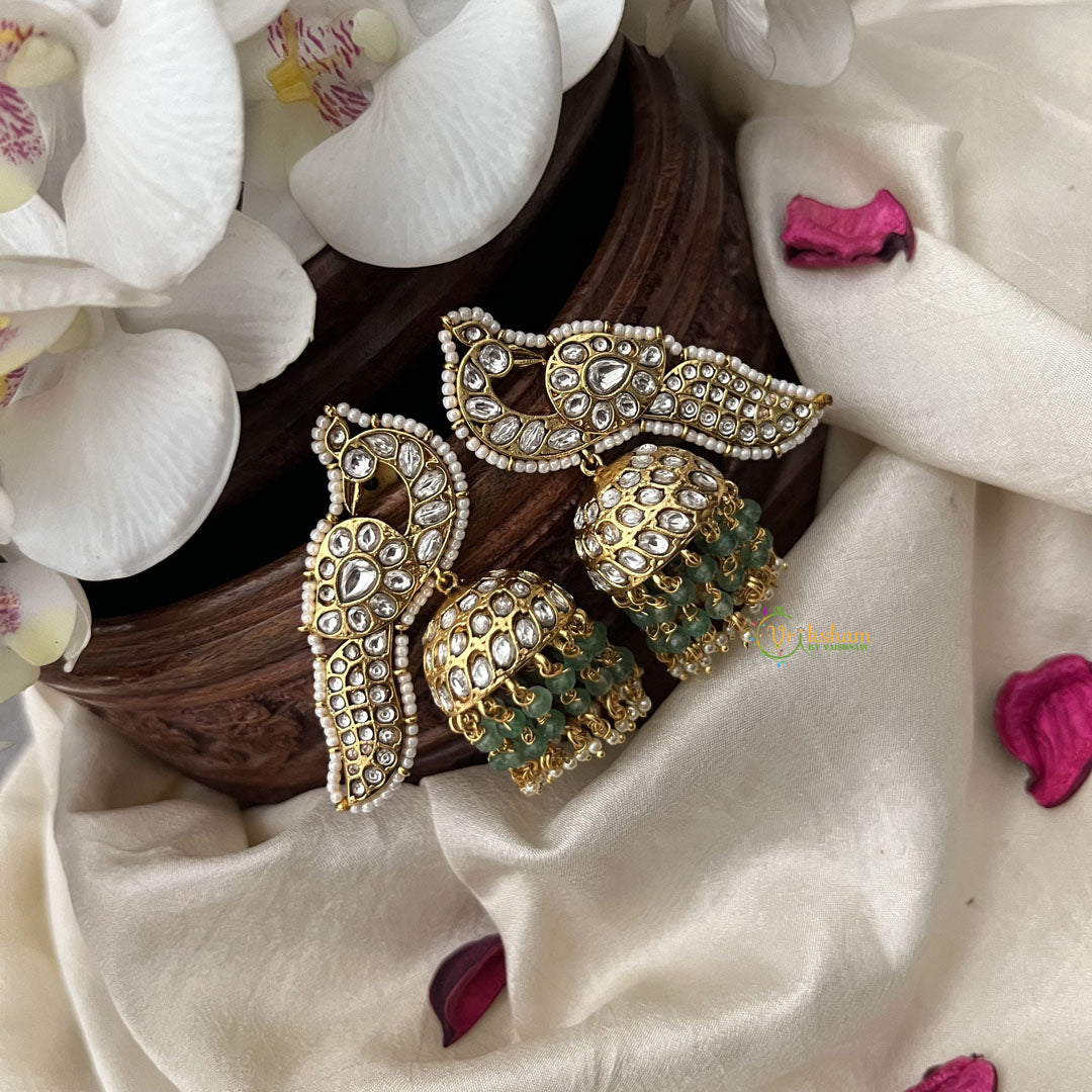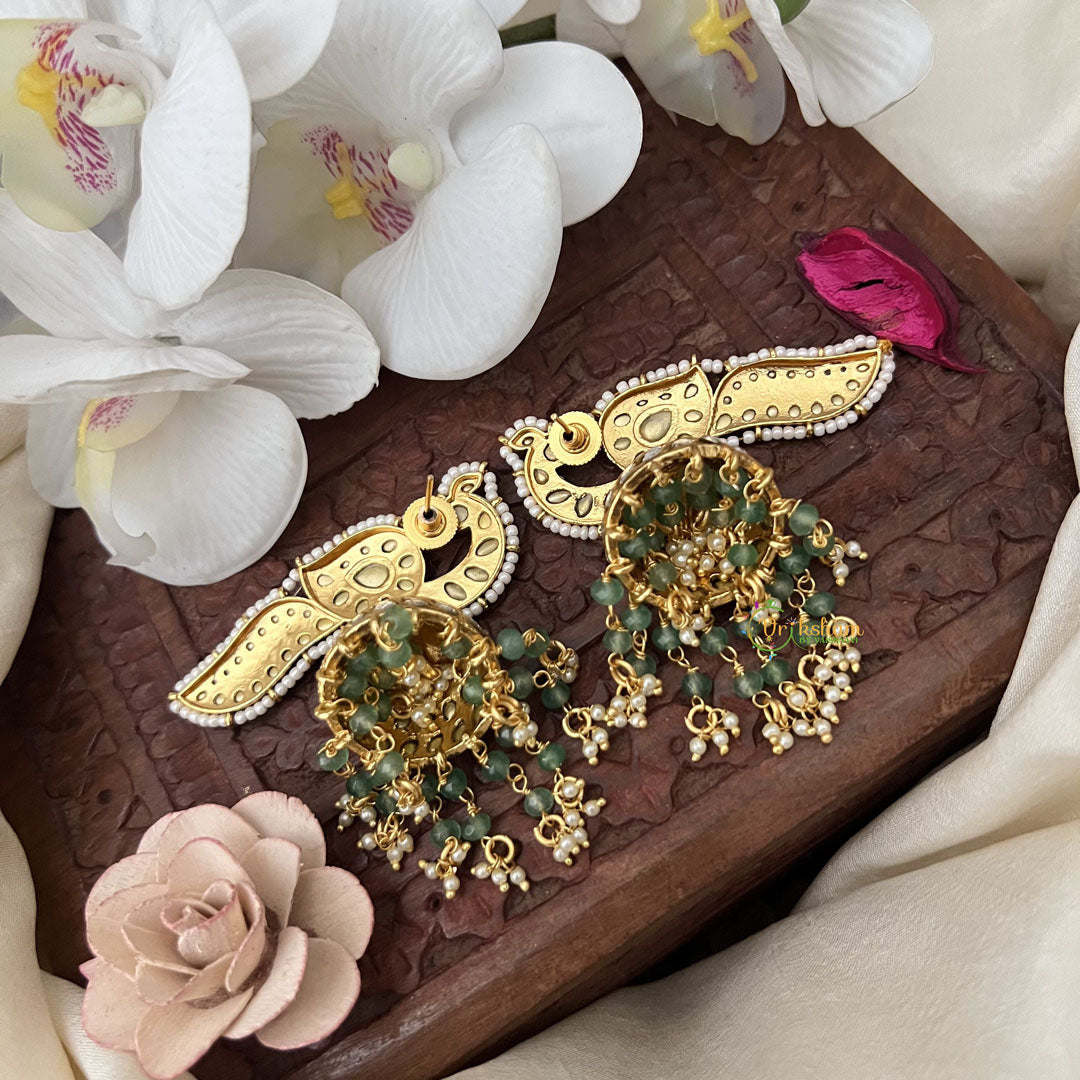 Exquisitely crafted Peacock Jhumkas featuring delicate white and pastel green beads. These elegant earrings blend traditional motifs with contemporary design, creating a refined statement piece. The subtle color palette ensures versatility, complementing both casual and formal attire with sophisticated charm.