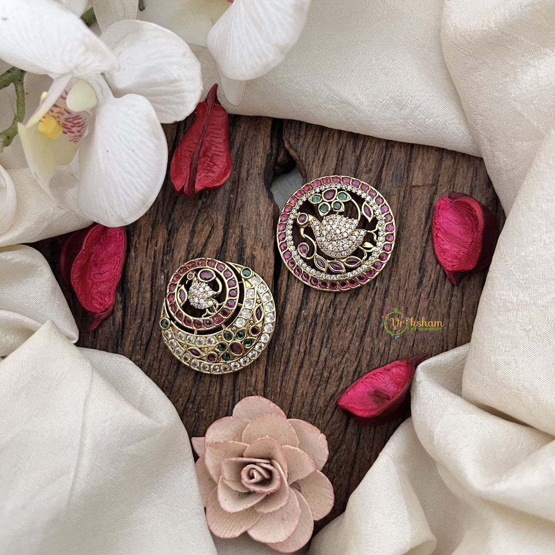 The Vriksham Elegant Peacock Red Ruby Chandran & Suryan Billai features a striking peacock design adorned with vibrant red ruby accents. This sophisticated piece blends intricate craftsmanship with rich color, making it an exquisite accessory to enhance traditional ensembles with elegance and cultural significance.