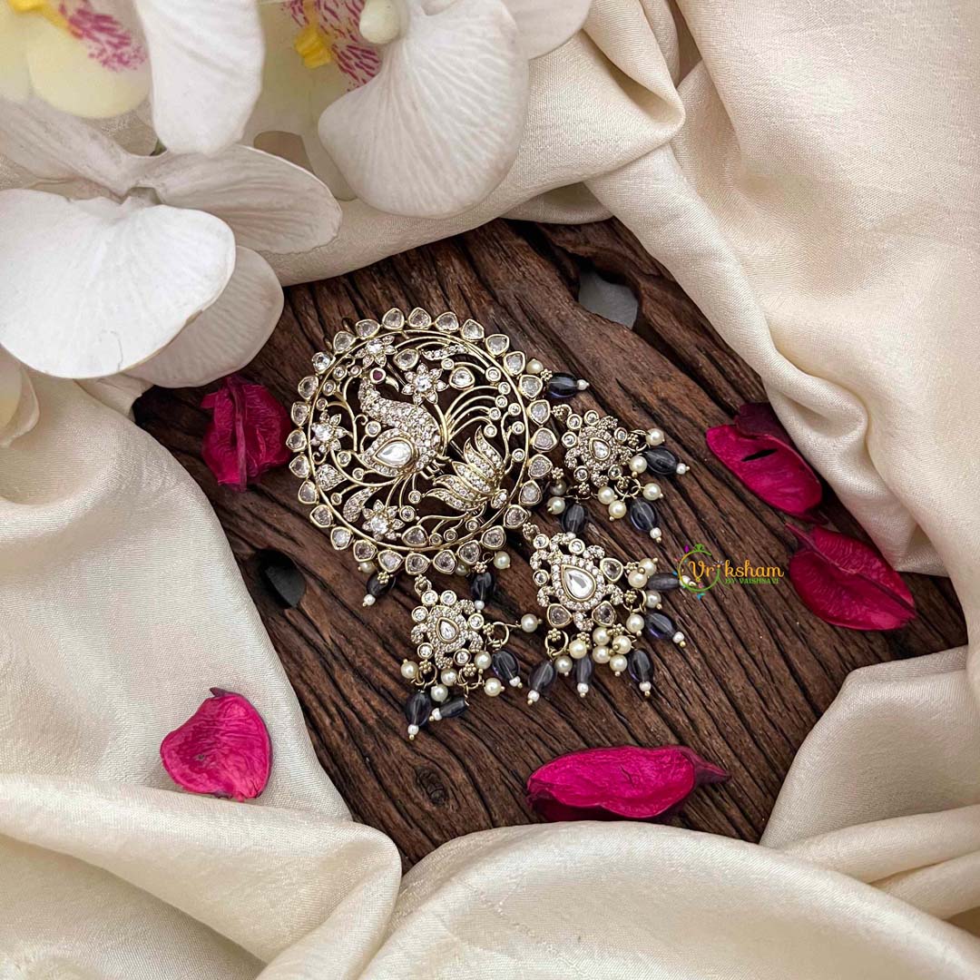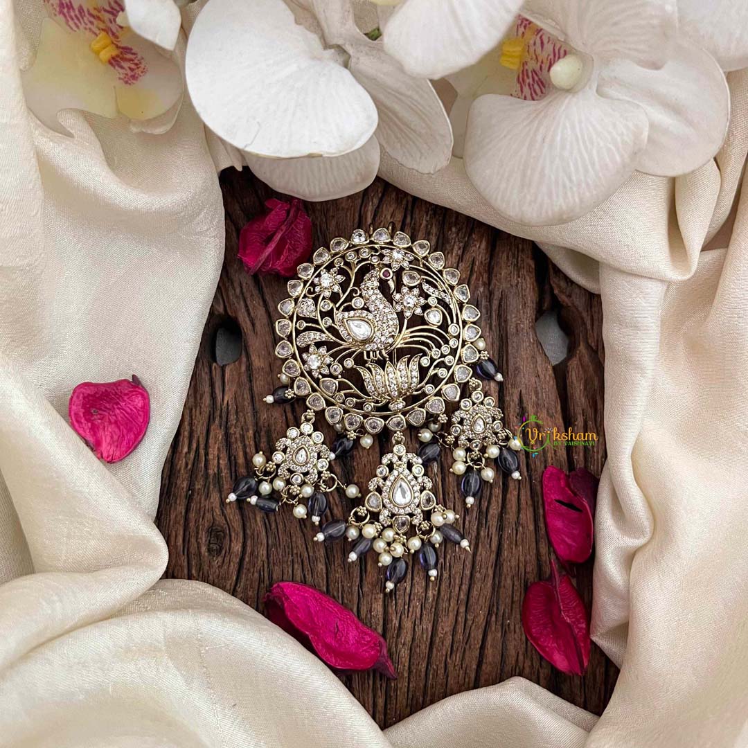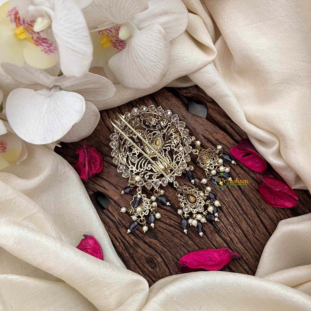 Indulge in the regal splendor of this Peacock Victorian Diamond Jada Billai, an exquisite creation adorned with rich purple beads and luminous pearls complemented by diamond embellishments. This ornamental masterpiece marries Victorian grandeur with authentic Indian artistry, celebrating the peacock's symbolic significance as a bearer of grace and nobility. The sumptuous purple palette evokes luxury and mystique, making it an exceptional choice for weddings, celebrations, and momentous occasions. Crafted with meticulous attention to detail, this piece radiates sophistication and cultural prestige, offering a distinguished accessory that transforms any formal ensemble into a showcase of refined elegance and timeless artistry.