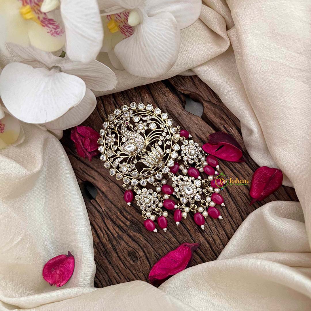 Experience the captivating allure of this Peacock Victorian Diamond Jada Billai, a resplendent ornament featuring vibrant red beads and lustrous pearls accented with diamond details. This exquisite piece harmonizes Victorian refinement with traditional Indian craftsmanship, celebrating the peacock as an emblem of beauty and prosperity. The bold crimson hue radiates confidence and passion, making it an ideal selection for weddings, festive celebrations, and prestigious events. Each element is meticulously crafted to deliver unparalleled sophistication and cultural resonance, presenting a distinguished accessory that elevates formal attire with timeless elegance and artistic excellence.
