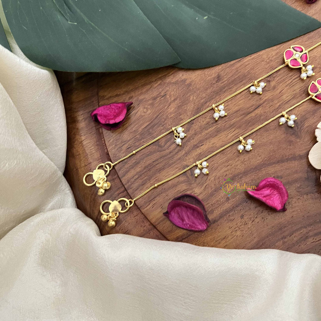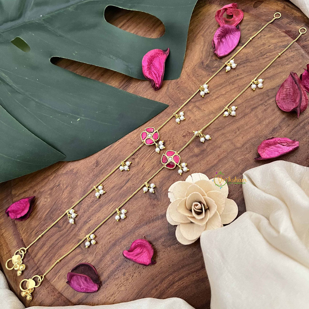 Celebrate refined elegance with these Pear Flower Jadau Kundan anklets, a harmonious blend of red and white that exudes timeless grace. Meticulously crafted using traditional kundan artistry, these anklets feature an intricate pear flower design embellished with lustrous stones that shimmer with every movement. The contrasting color palette creates a striking visual appeal, perfect for both grand celebrations and refined everyday styling. Each anklet represents exceptional craftsmanship and attention to detail, making them an exquisite addition to your jewelry collection for those who appreciate the marriage of classical design with contemporary sophistication.