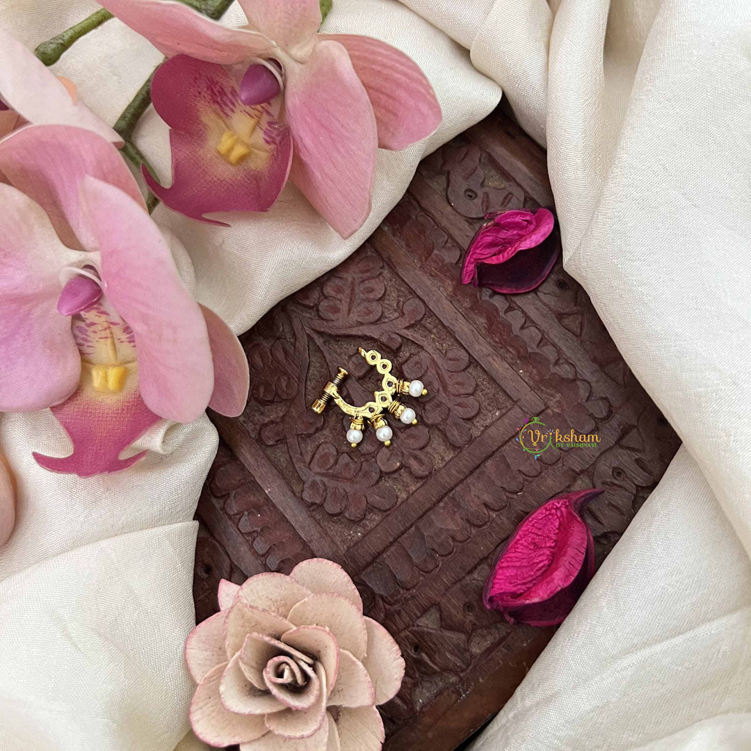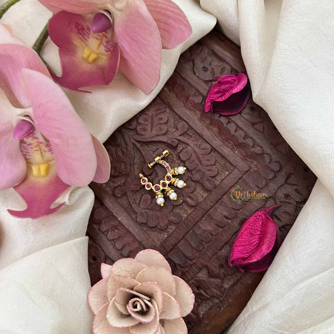 The Vriksham Elegant Pear Style Press Nose Pin in red with pearl accents combines classic pear-shaped design with lustrous pearl detailing. Crafted for effortless wear with a secure press-fit, this sophisticated accessory adds a graceful and timeless charm to any ensemble.