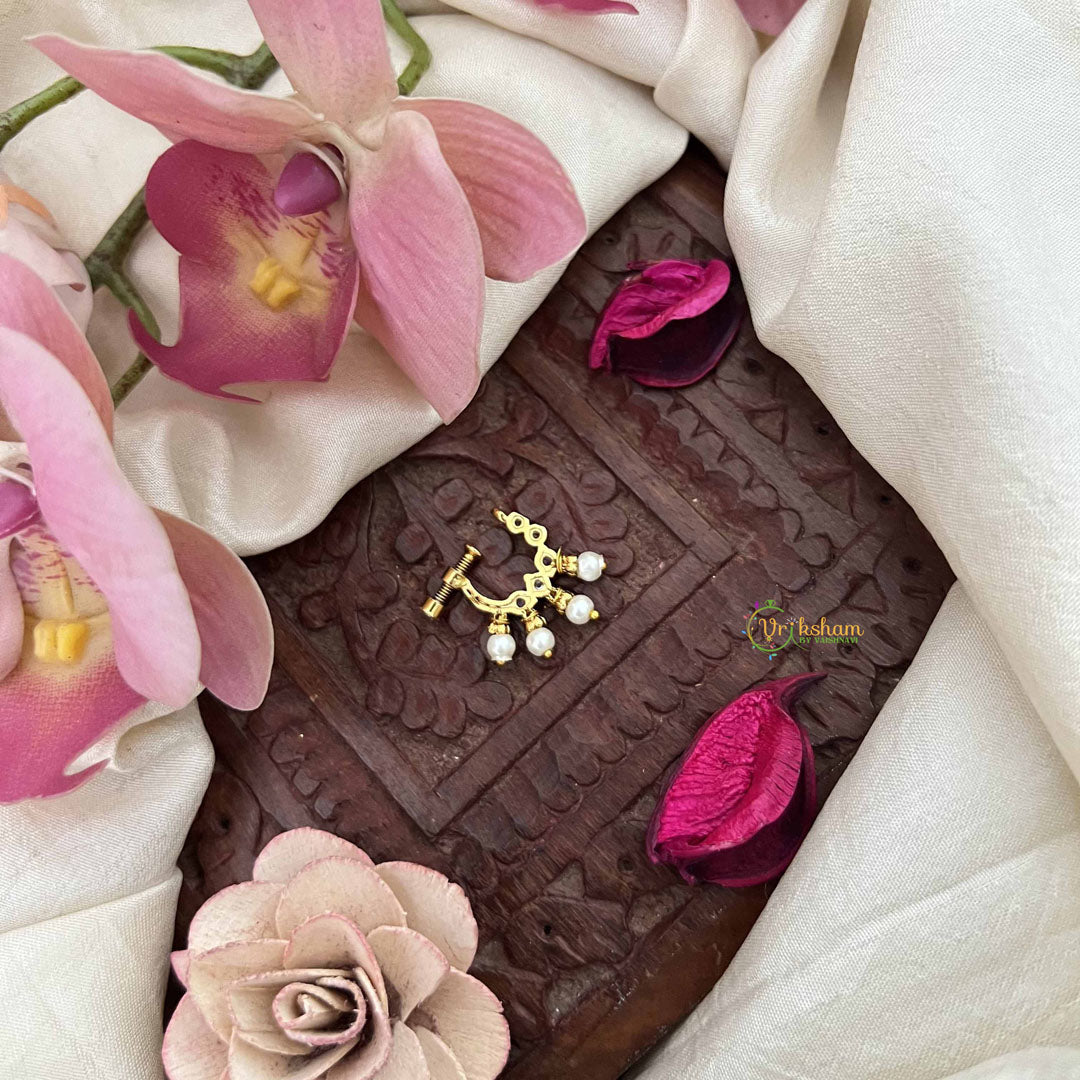 The Vriksham Elegant Pear Style Press Nose Pin in red and white features delicate pearl accents within a refined pear-shaped design. Combining classic elegance with a comfortable press-fit mechanism, this sophisticated accessory adds a subtle touch of grace and charm to any look.