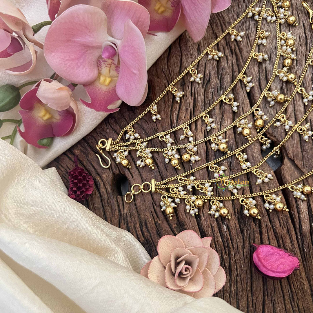 Elevate your traditional ensemble with this exquisite three-layered maatil, where lustrous pearls and gleaming gold beads converge in harmonious elegance. Each strand is meticulously crafted to drape gracefully, creating a refined silhouette that complements both classic and contemporary styling. The interplay of pearl luminescence and gold accents adds timeless sophistication to your jewelry collection, making it an ideal choice for weddings, festivals, and special occasions. A versatile piece that transforms any outfit into a statement of understated luxury.