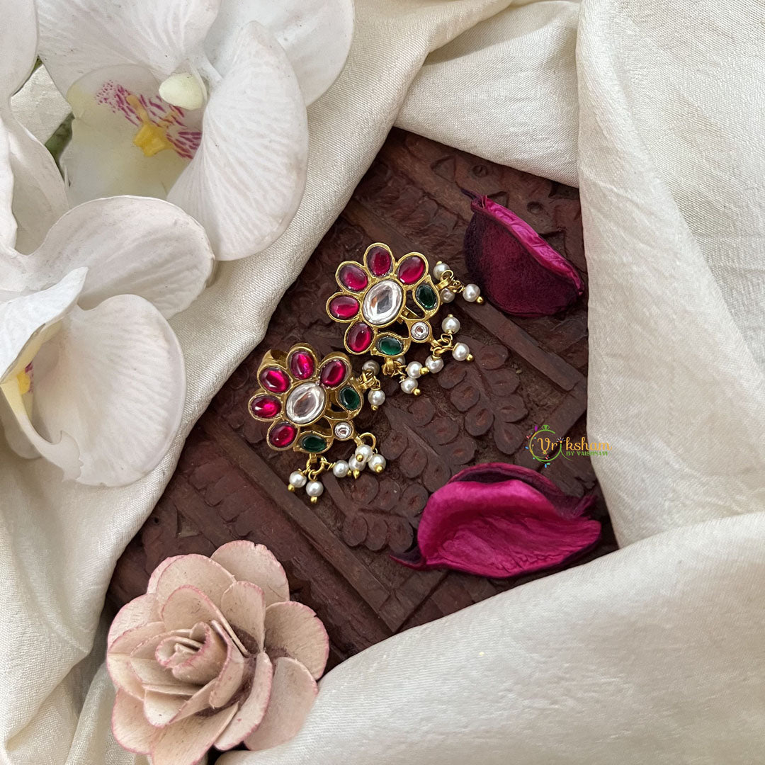 The Vriksham Elegant Phool Mahal Jadau Press Bugadi in red, green, and white, accented with pearls, features a sophisticated floral mahal design crafted with intricate kundan and jadau artistry. This elegant accessory adds timeless beauty and refined charm to traditional attire, perfect for enhancing your look on special occasions.