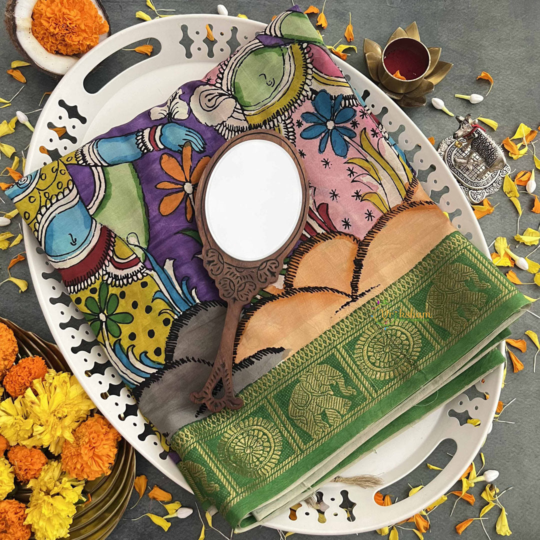 Indulge in luxury with our Blue Kalamkari Saree. Made from the finest Kalamkari chiniya silk, this saree exudes elegance. Adorned with a beautiful Nizam border, it adds a touch of sophistication to your look. Elevate your style with this exclusive piece.