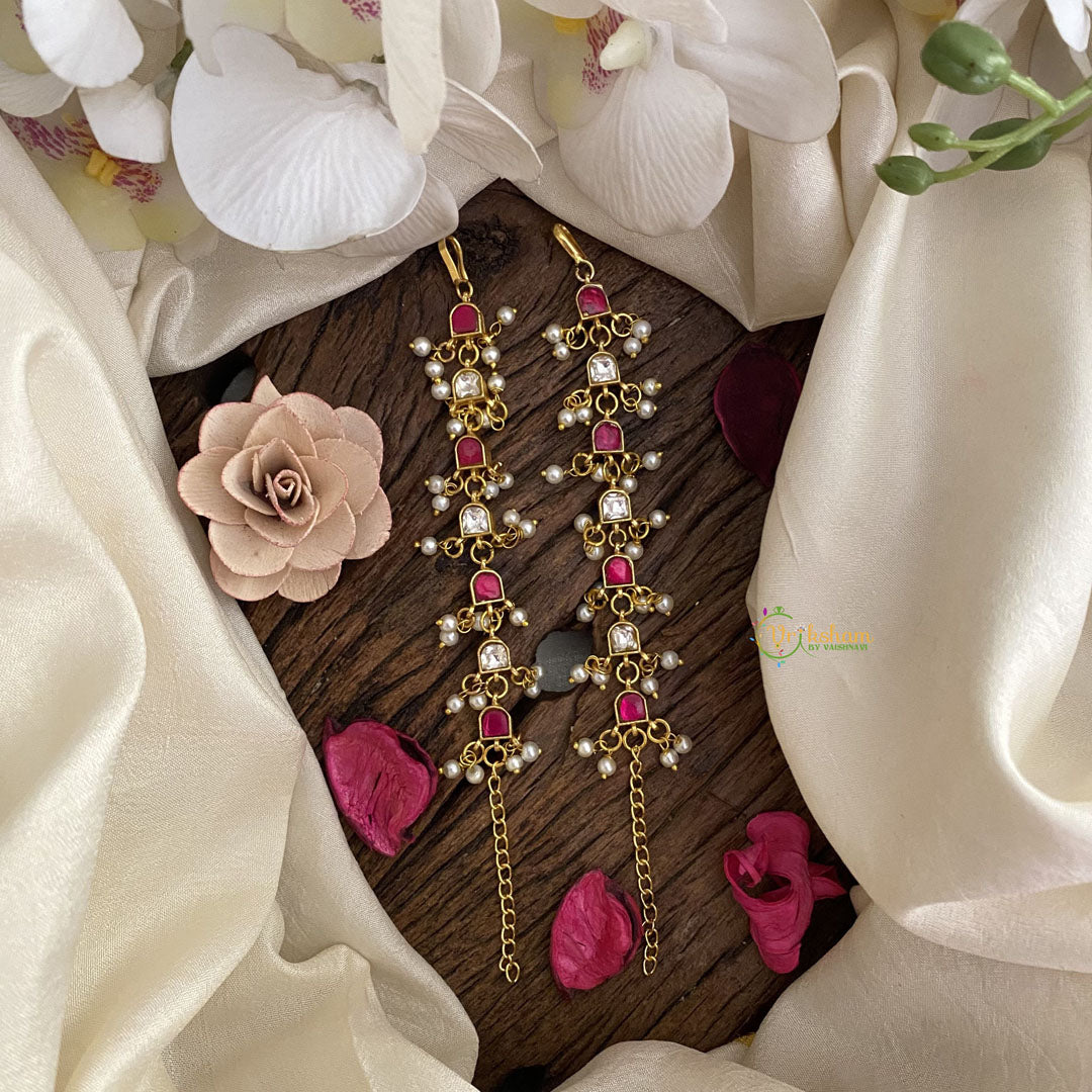 Indulge in sophistication and elegance with our Vriksham Elegant Red White Stone Single Strand Maatil. Adorned with stunning red and white stones, and a white pearl, this single strand necklace will elevate any outfit to luxury status. Make a statement and exude exclusivity with this one-of-a-kind piece.