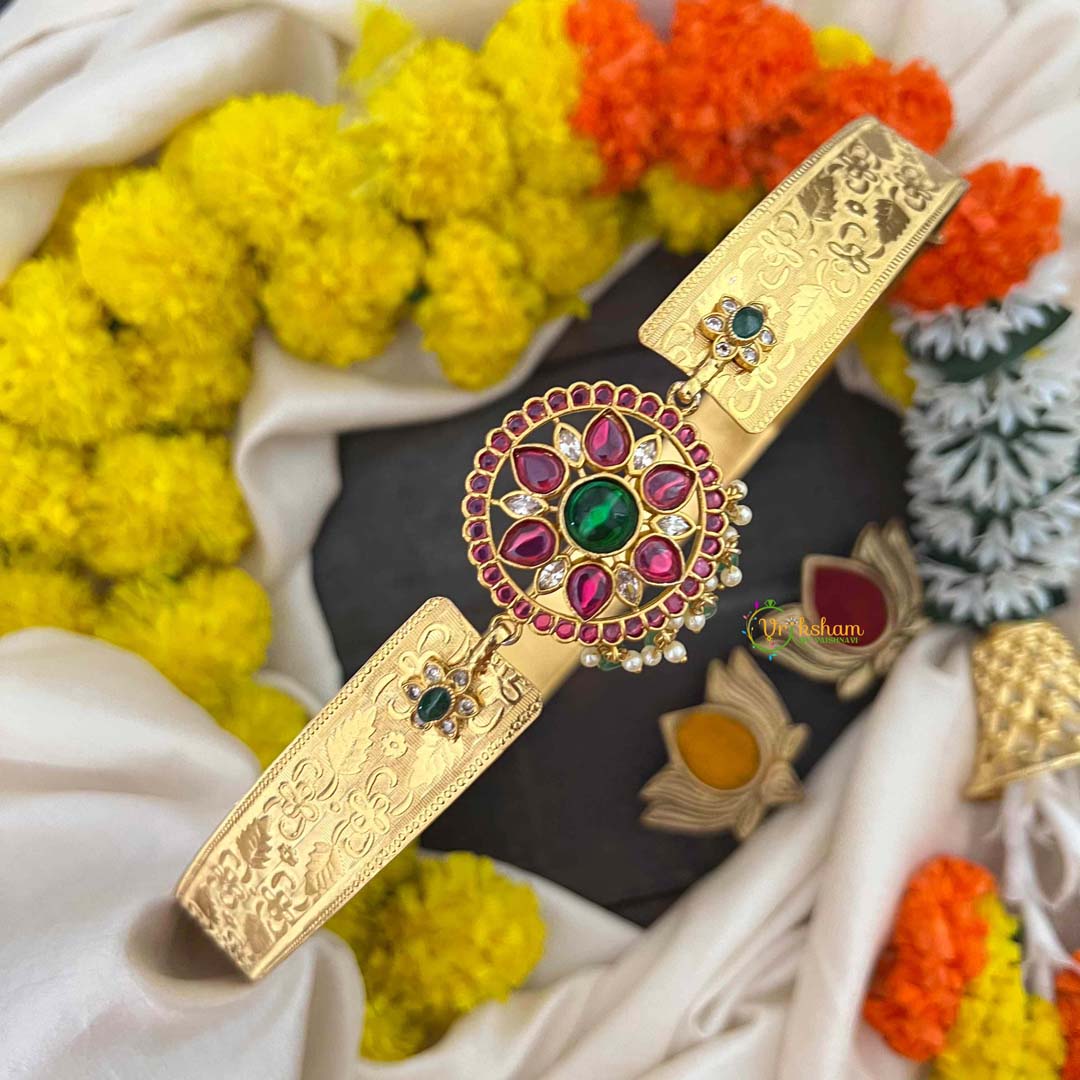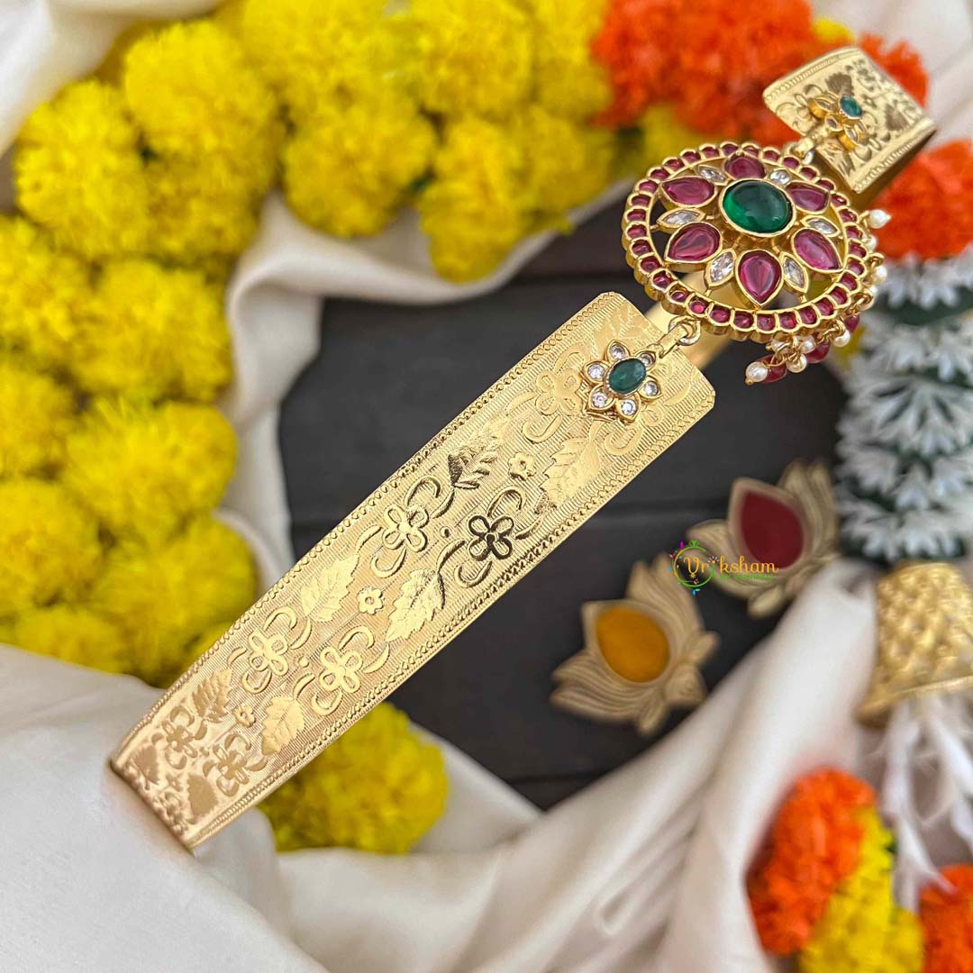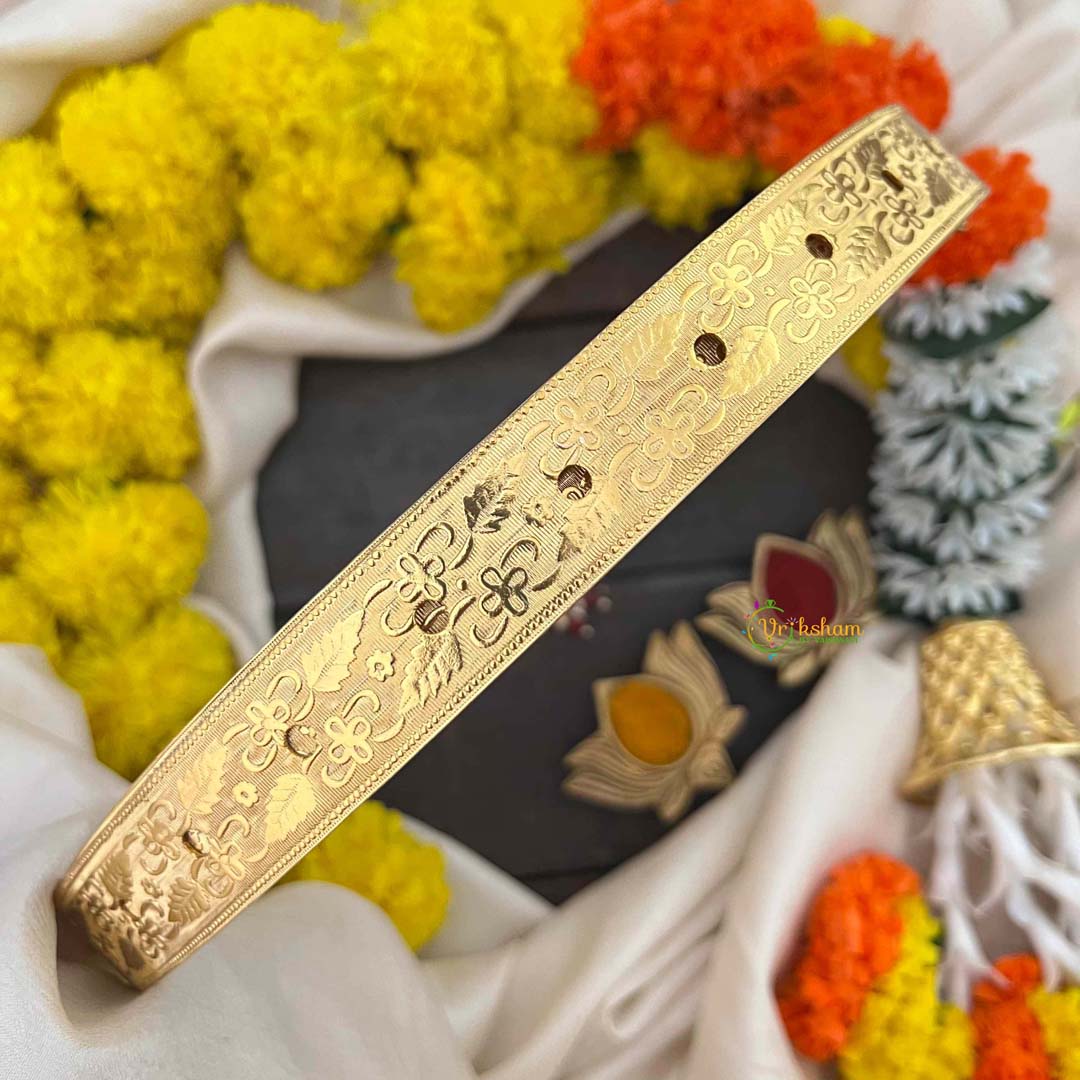 Discover timeless beauty with this Elegant Round Floral Bridal Hipbelt, featuring a sophisticated Antique Gold Finish adorned with exquisite Floral and Leaf motifs. The circular design creates a balanced, harmonious silhouette that complements any bridal ensemble with understated grace. Intricate botanical patterns in antique gold evoke natural elegance and refined craftsmanship, perfect for brides who appreciate subtle sophistication. Each leaf and flower detail is meticulously rendered from natural stones and premium brass metal alloys, showcasing Vriksham's dedication to quality. The warm antique gold patina adds vintage charm and depth to your wedding day look. An ideal choice for brides seeking a nature-inspired accessory that blends classical design with contemporary bridal sensibilities.