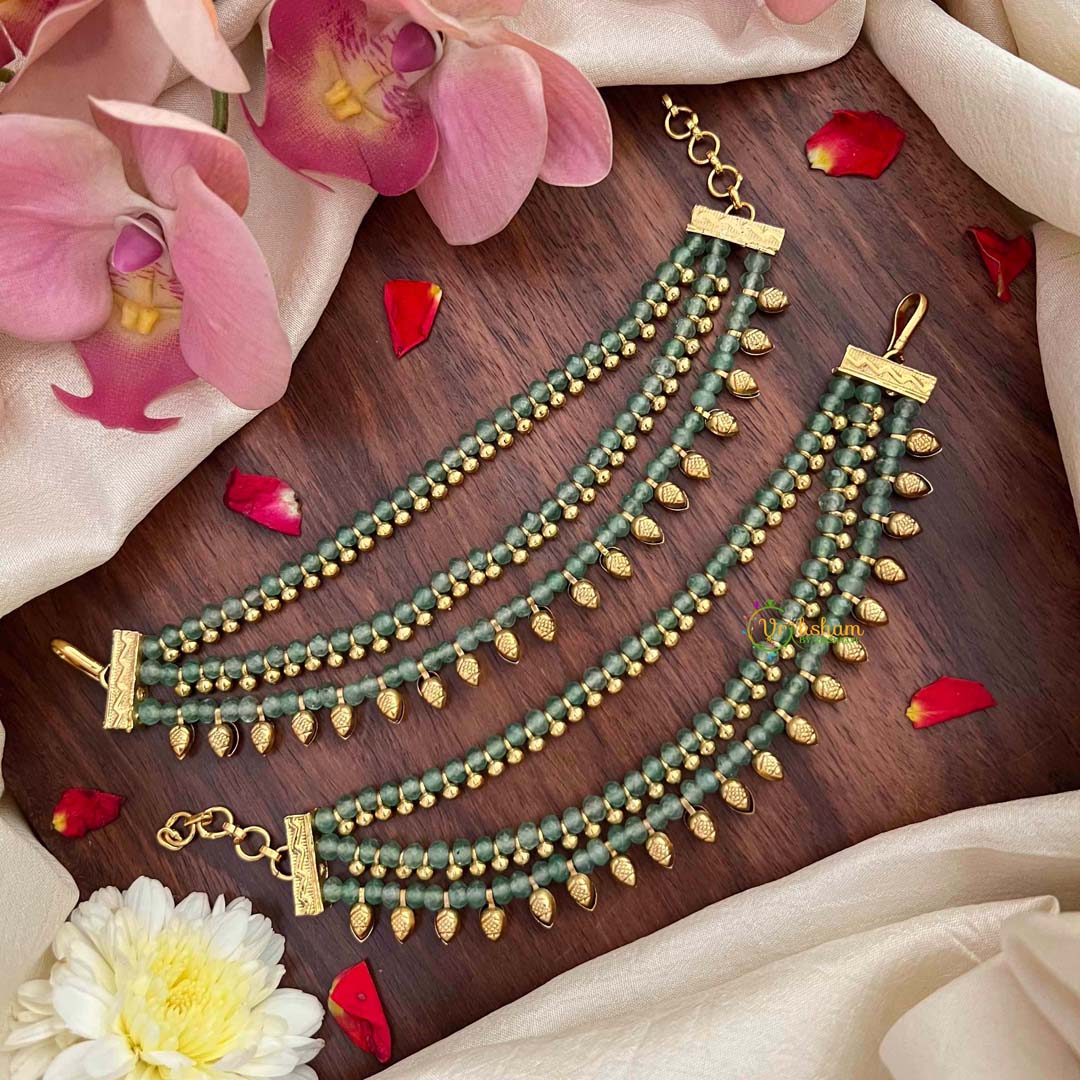 Indulge in serene elegance with this enchanting maatil, featuring delicate sea-green beading across its three-layered silhouette. Adorned with charming gold bud accents, this piece captures the tranquility of nature with refined sophistication. The harmonious blend of cool aquamarine tones and warm golden details creates a captivating visual balance, perfect for celebrations, ceremonies, and cherished moments. The intricate beadwork and ornamental charms showcase meticulous craftsmanship, lending an air of understated luxury. A truly graceful accessory that celebrates natural beauty while exuding contemporary elegance and timeless sophistication.