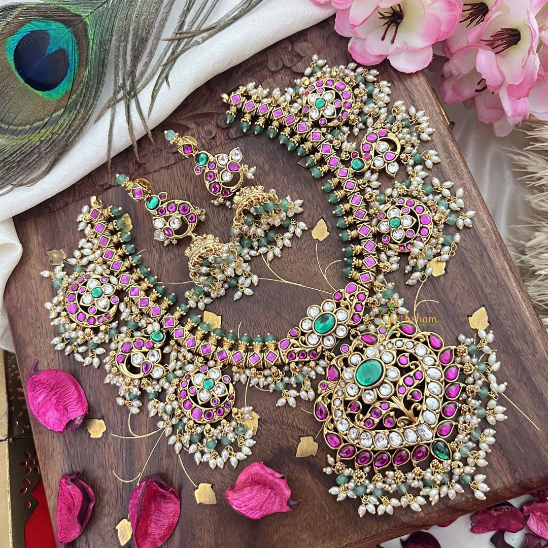 Elevate your style with our Vriksham Exquisite Short Guttapusalu Neckpiece. Made with delicate Rice Pearls, this neckpiece exudes sophistication and luxury. Its intricate design and high-quality materials will make you feel like a true fashion icon. Upgrade your jewelry collection with this exclusive piece.