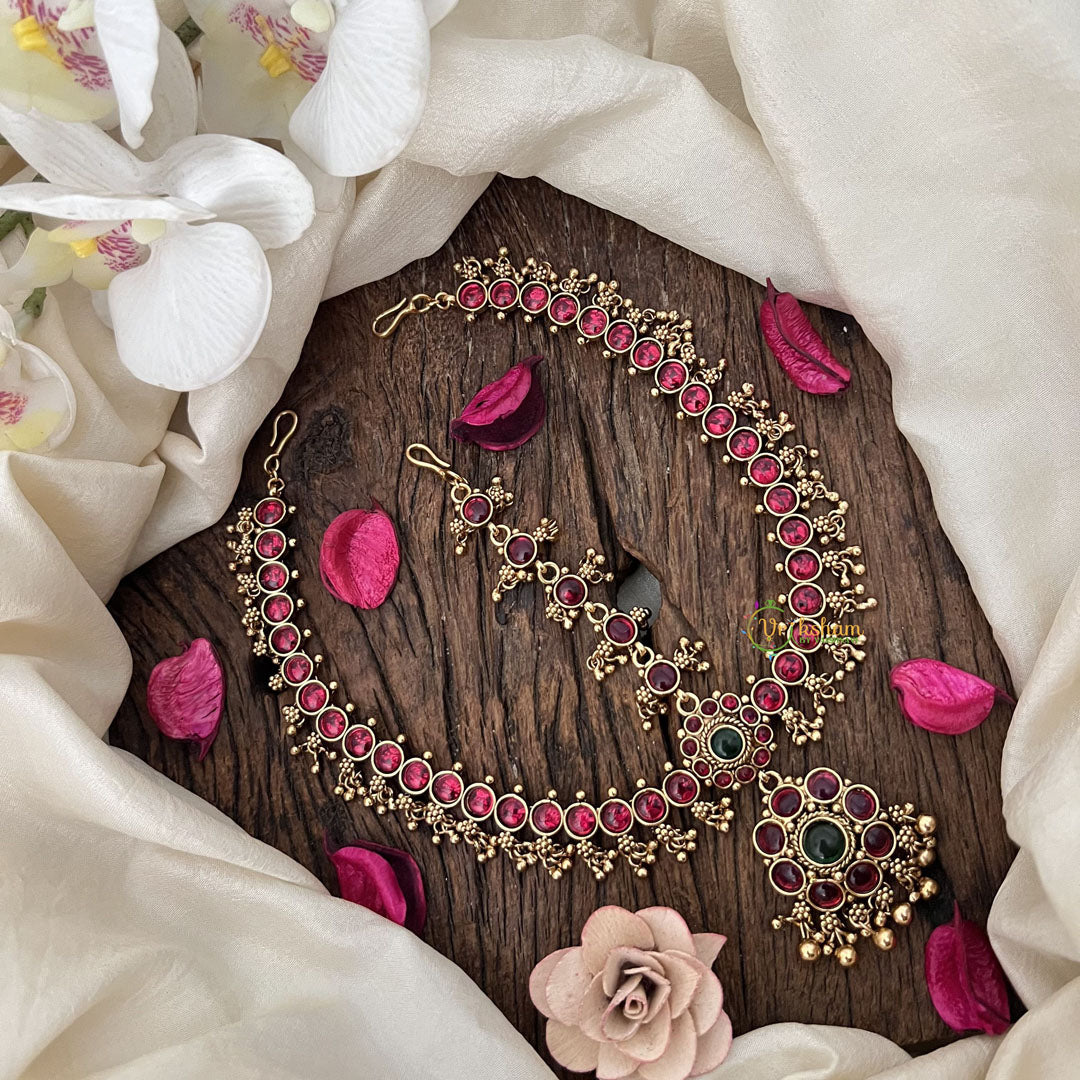 The Vriksham Elegant Stone Floral Style Double Side Maang Tikka features a sophisticated floral design embellished with vibrant red and green stones, complemented by delicate gold beads. This elegant piece adds a refined and timeless charm to traditional ensembles, perfect for enhancing your look with subtle grace on special occasions.
