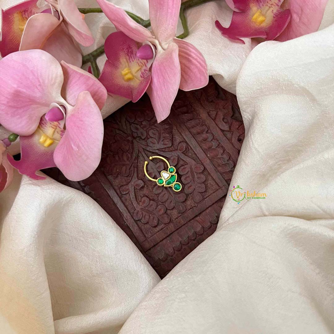 Indulge in refined elegance with this stunning Kundan Jadau septum ring, showcasing luminous white and lush green gemstones set with meticulous artistry. Each stone is carefully positioned to create a harmonious interplay of light and color, reflecting traditional jewelry-making mastery. This sophisticated piece transcends fleeting trends, offering a timeless accessory for those with cultivated taste. The serene color palette exudes grace and poise, making it an ideal choice for elevating both everyday elegance and special occasions with understated luxury.