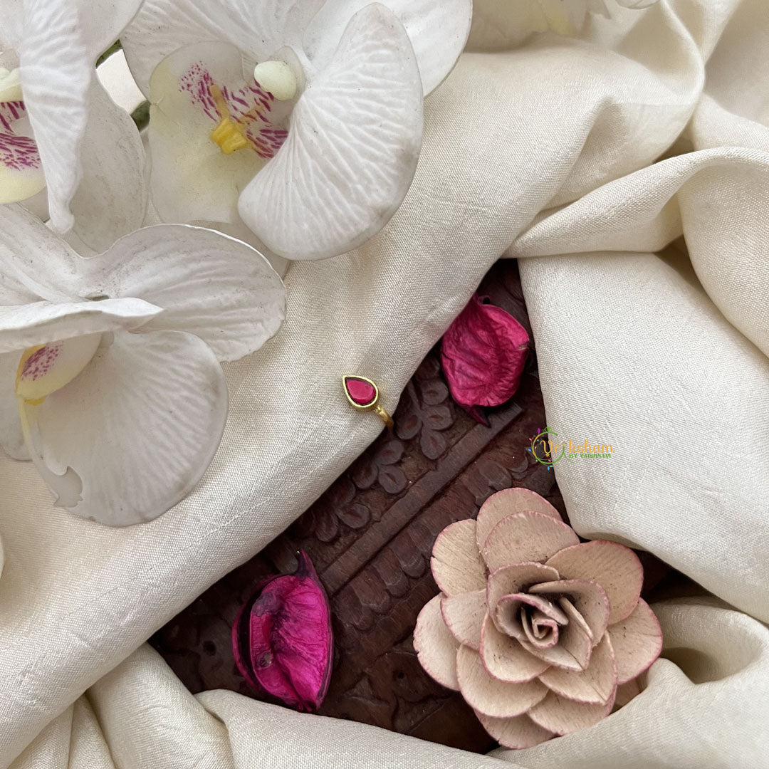 Elevate your traditional look with the Vriksham Elegant Tear Drop Jadau Kundan Nath in radiant red. Expertly crafted with intricate jadau and kundan work, this exquisite nose ring adds a refined touch of heritage and grace to any ensemble. Its tear drop design blends classic artistry with timeless elegance, perfect for special occasions or cultural celebrations.