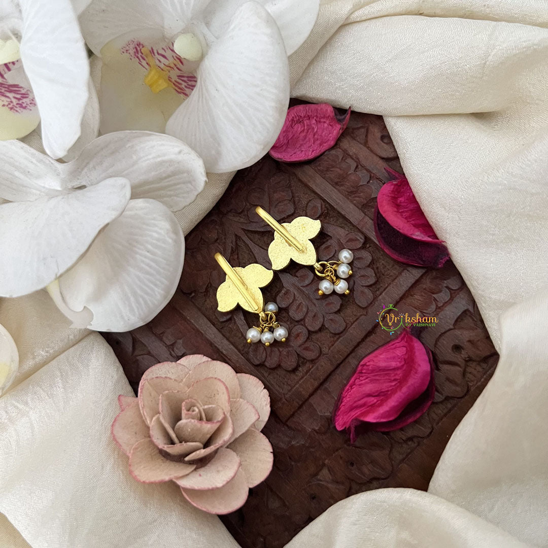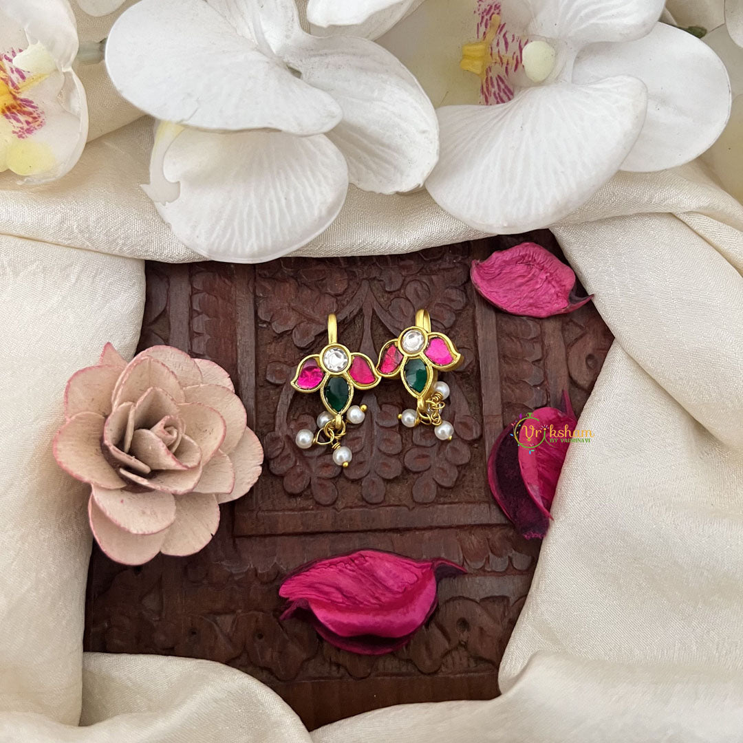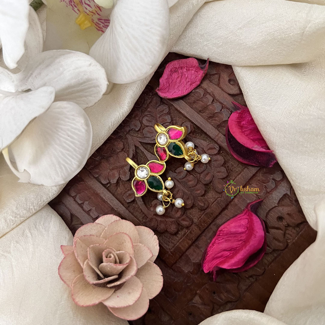 The Vriksham Elegant Three Leaf Kundan Jadau Press Bugadi features a refined design inspired by the natural beauty of three leaves, adorned with red, green, and white hues accented by delicate pearls. This sophisticated piece exemplifies traditional Kundan craftsmanship, offering a graceful accessory that enhances any ethnic ensemble with timeless elegance.