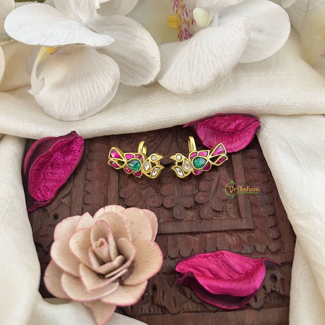 The Vriksham Elegant Titli Leher Kundan Jadau Press Bugadi in green, red, and white features a graceful butterfly wave design, meticulously crafted with intricate kundan and jadau work. This sophisticated accessory adds a delicate and timeless elegance to traditional attire, perfect for enhancing your look on special
