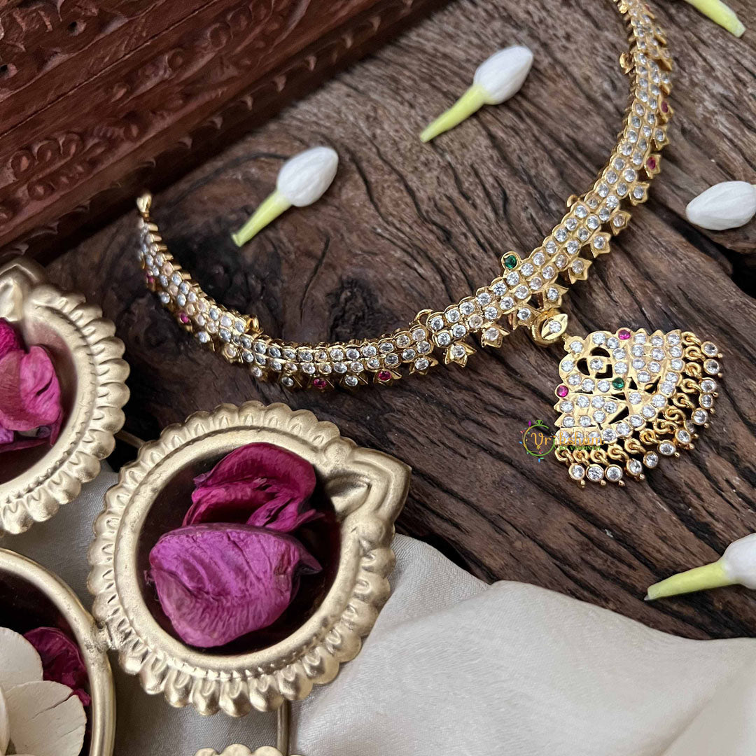 Indulge in understated luxury with this elegant peacock pendant neckpiece, where emerald green and ruby red accents beautifully complement a luminous white setting. Adorned with cascading diamond drops, this short neckpiece radiates refined sophistication suitable for discerning occasions. The peacock motif, rendered with exquisite detail, symbolizes grace and beauty while the sparkling diamonds amplify its allure. Perfect for weddings, celebrations, or moments when you desire to make a subtle yet striking impression. This versatile piece bridges traditional artistry with contemporary elegance, making it an essential addition to any jewelry wardrobe seeking timeless appeal and distinctive character.