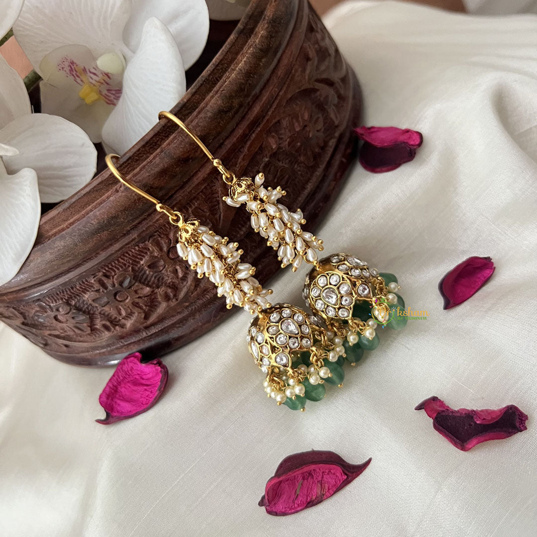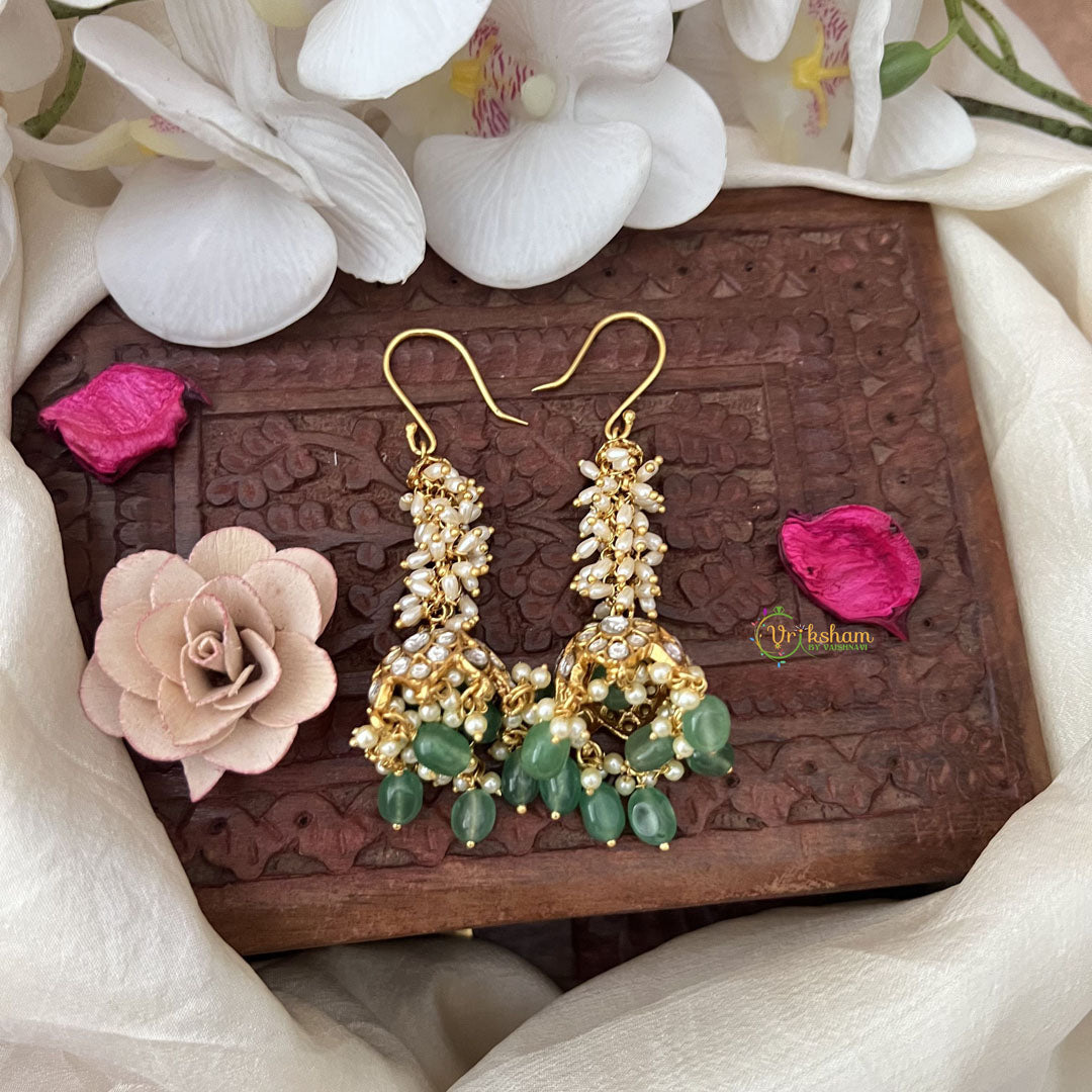 Embrace ethereal refinement with our Vriksham Elegant White Stone Hook Jhumka. These distinguished earrings feature luminous white stones artfully arranged in a sophisticated hook design, complemented by delicate pastel green beads and exquisite rice pearls. The harmonious interplay of textures and subtle hues creates a captivating aesthetic that whispers luxury rather than declares it. Perfect for the discerning individual who appreciates nuanced elegance and artisanal craftsmanship in their statement accessories.