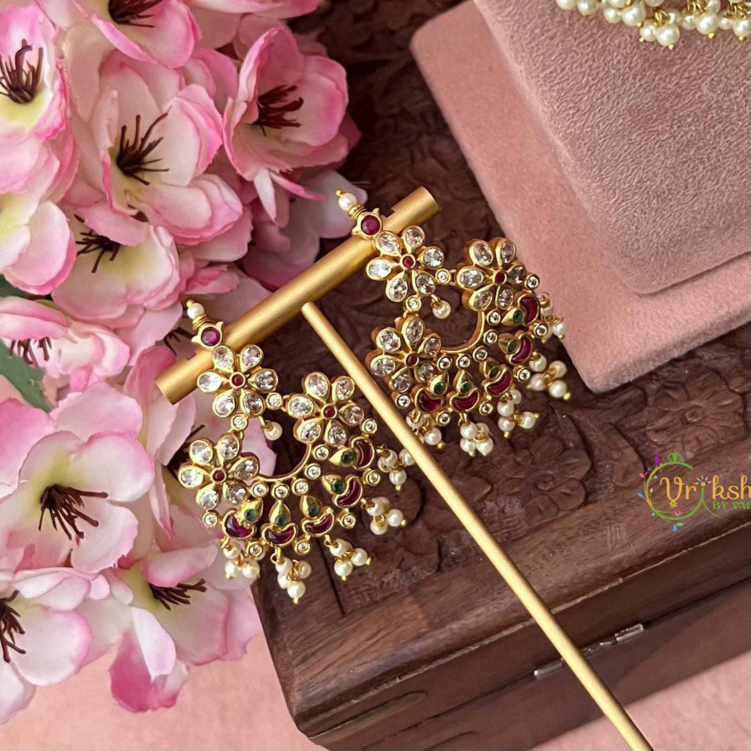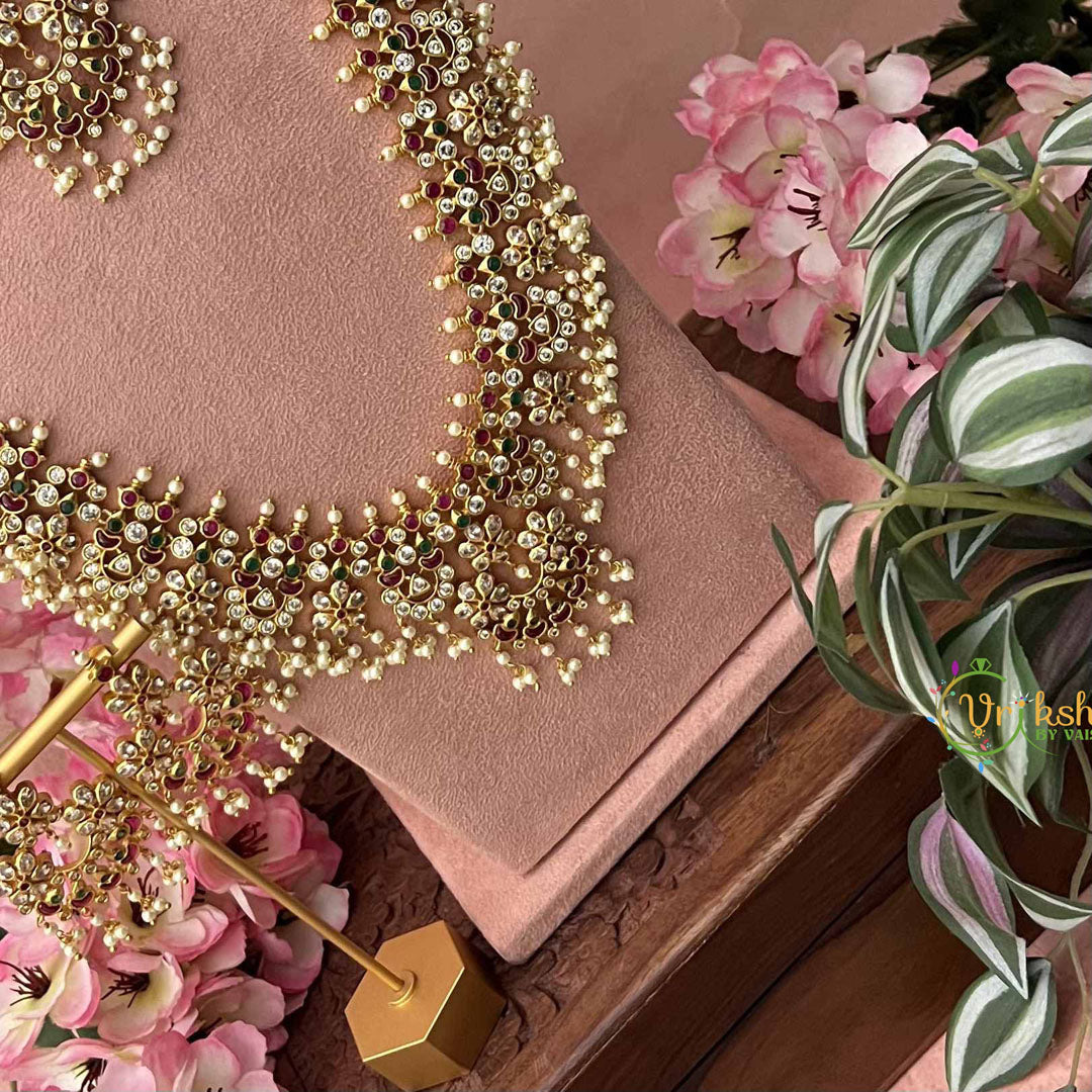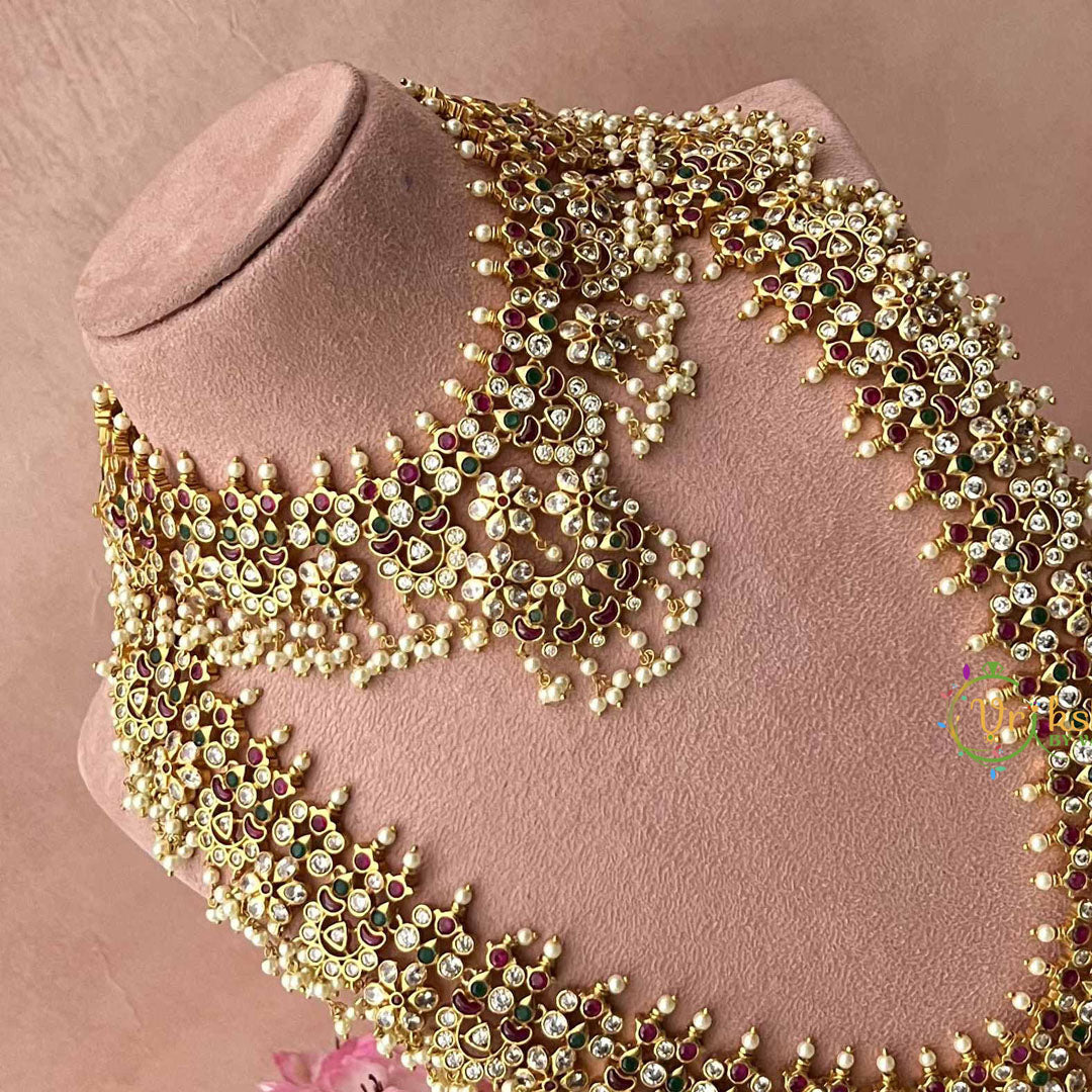 Indulge in refined sophistication with this exquisite bridal set, where premium pearls are meticulously integrated into every element. The traditional Guttapusalu technique demonstrates exceptional craftsmanship, creating ornate detailing that radiates understated opulence. Each pearl is carefully selected and positioned to enhance the piece's luminous beauty and visual harmony. Designed for the discerning bride who appreciates authentic artistry and enduring quality, this set embodies timeless elegance and cultural pride, making it a treasured addition to any bridal collection.