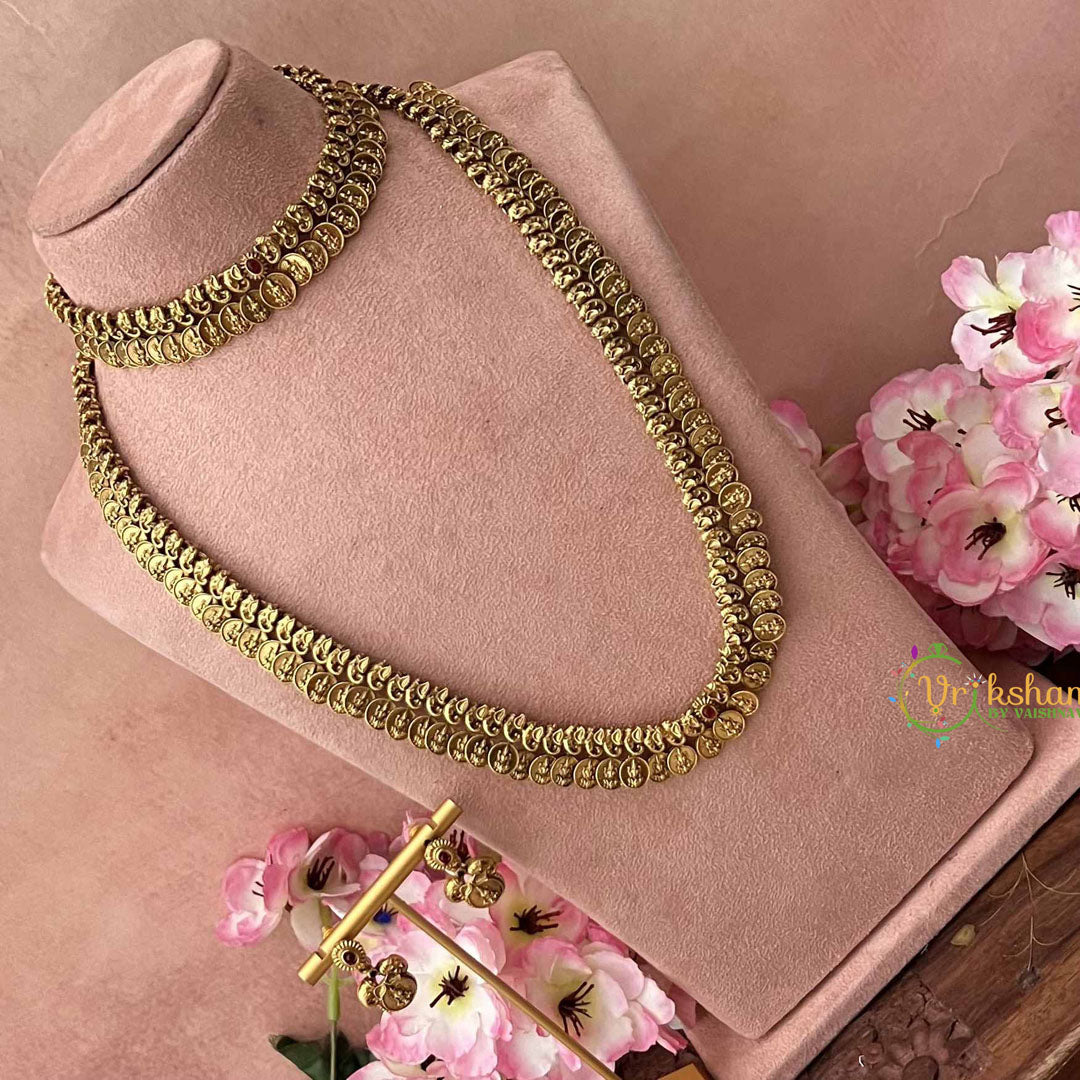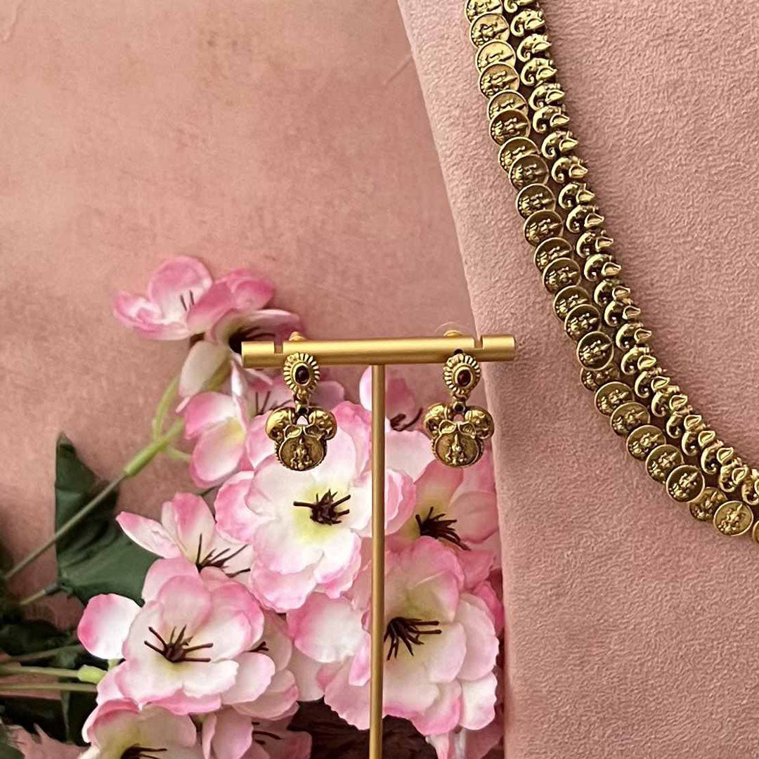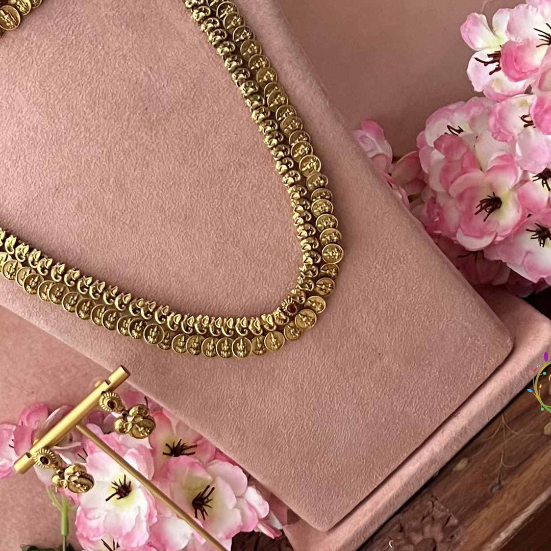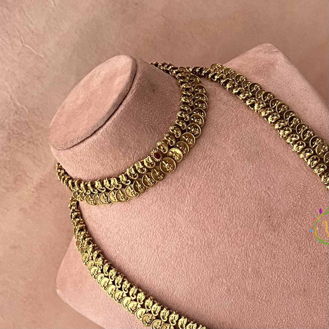 Celebrate divine blessings with this distinguished bridal set, featuring the sacred elephant idol alongside lotus and Lakshmi motifs in an elegant kasu mala design. This collection honors traditional symbolism, where the elephant represents wisdom and prosperity while the lotus embodies purity and grace. Meticulously crafted with refined detailing, each piece serves as a meaningful expression of cultural heritage and spiritual devotion. An exceptional choice for brides seeking jewelry that combines auspicious symbolism with sophisticated artistry and timeless appeal.