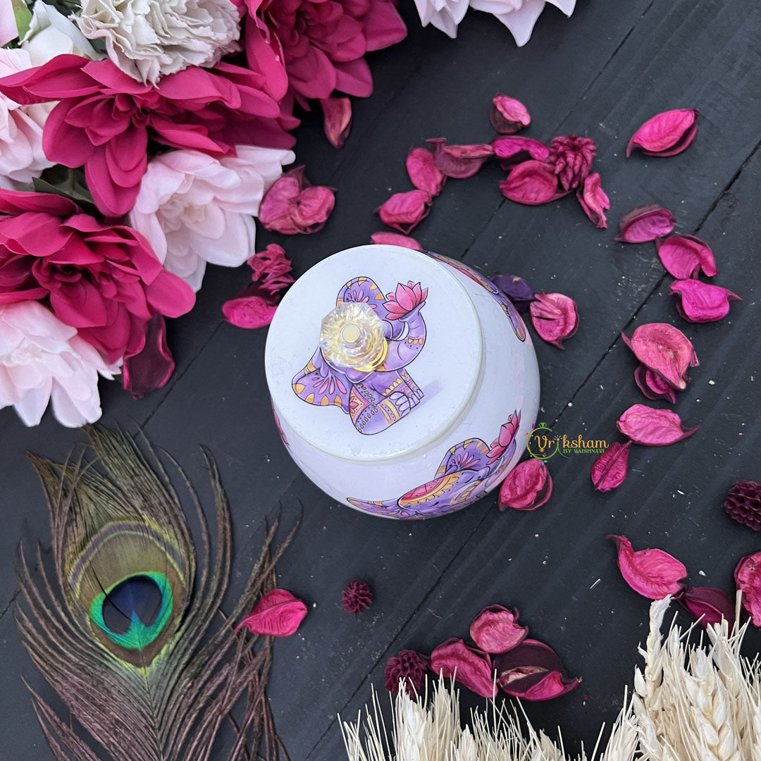Elevate your décor with the Vriksham Elephant Metal Pichwai Jar in elegant white and purple hues. Crafted with meticulous detail, this jar blends traditional artistry with refined metalwork, making it a distinguished accent piece. Its sophisticated design adds a touch of cultural heritage and timeless charm to any space. Perfect for collectors or as a unique gift, this jar embodies both beauty and craftsmanship.